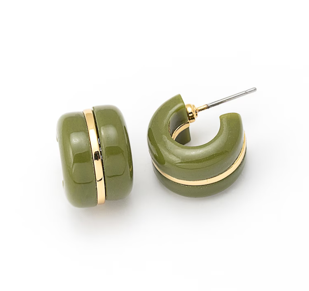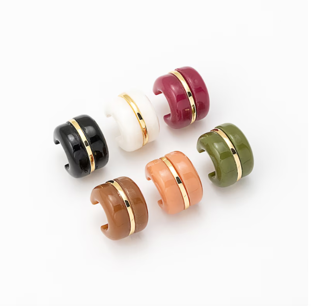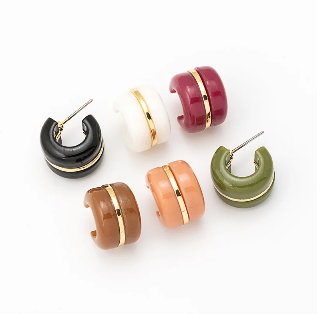 Cute, colorful, and light. These little 15mm resin and gold plate hoops are the perfect surcees or every day earrings for yourself!
