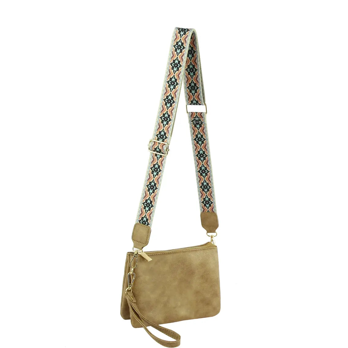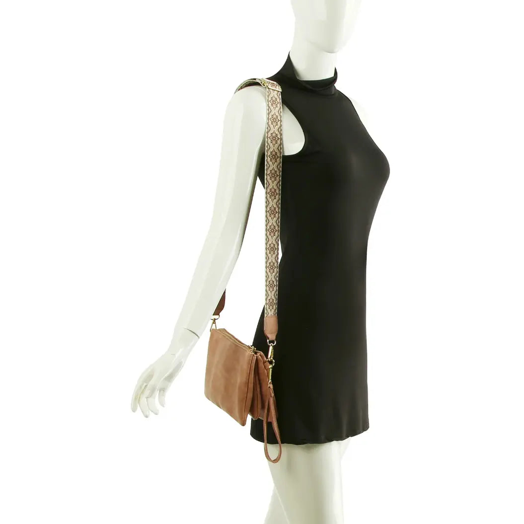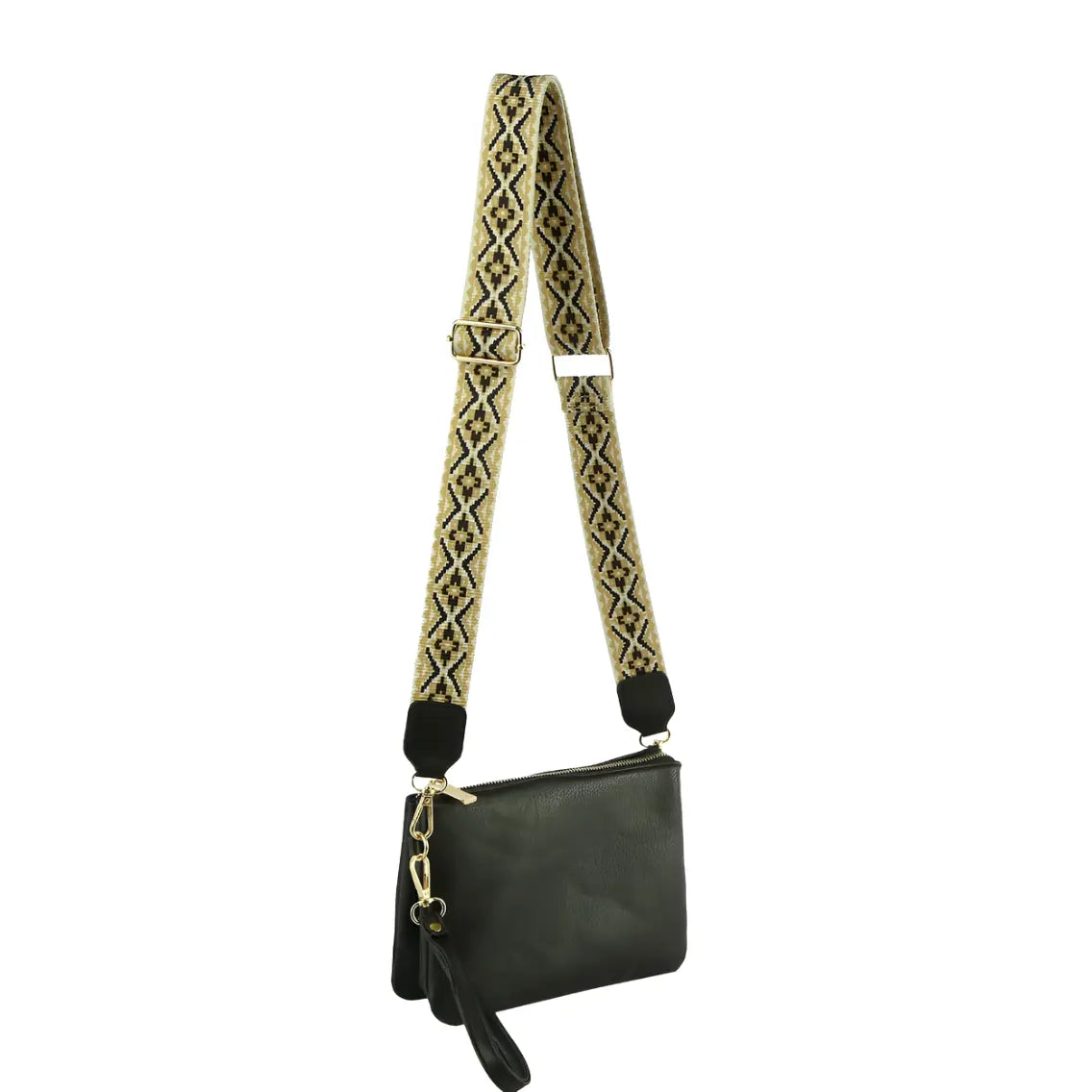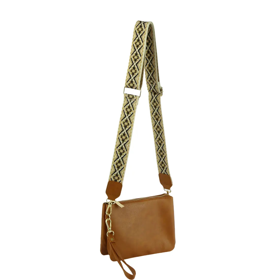 Elevate your style with our Multi Compartment Crossbody Bag! Crafted with faux vegan leather, zip top closure, and gold-tone hardware, this bag offers both function and fashion. The detachable and adjustable shoulder strap adds versatility, while the Aztec pattern guitar strap adds a unique touch. L 8.8 * H 6.1 * W 2.5.