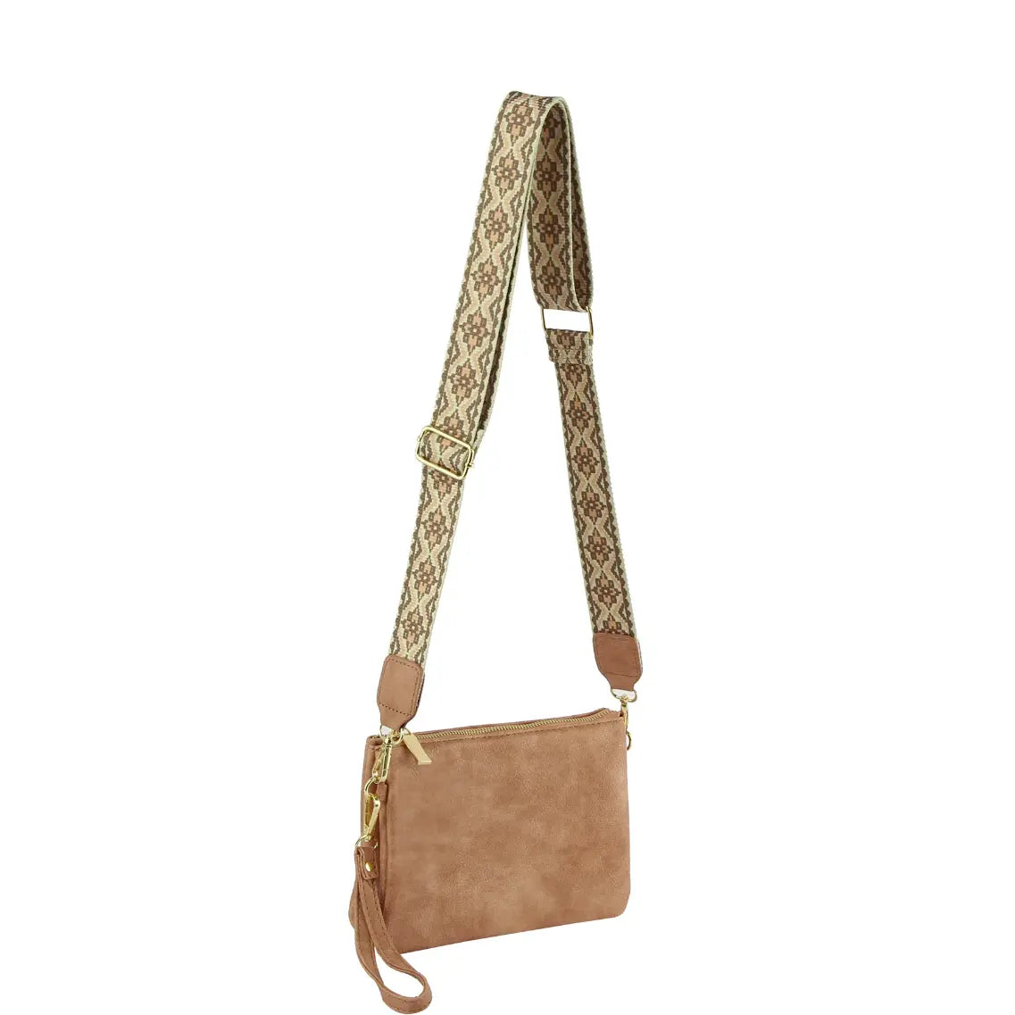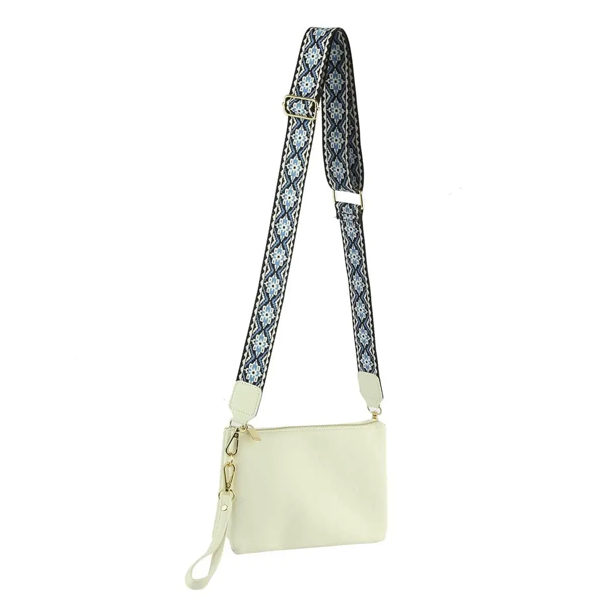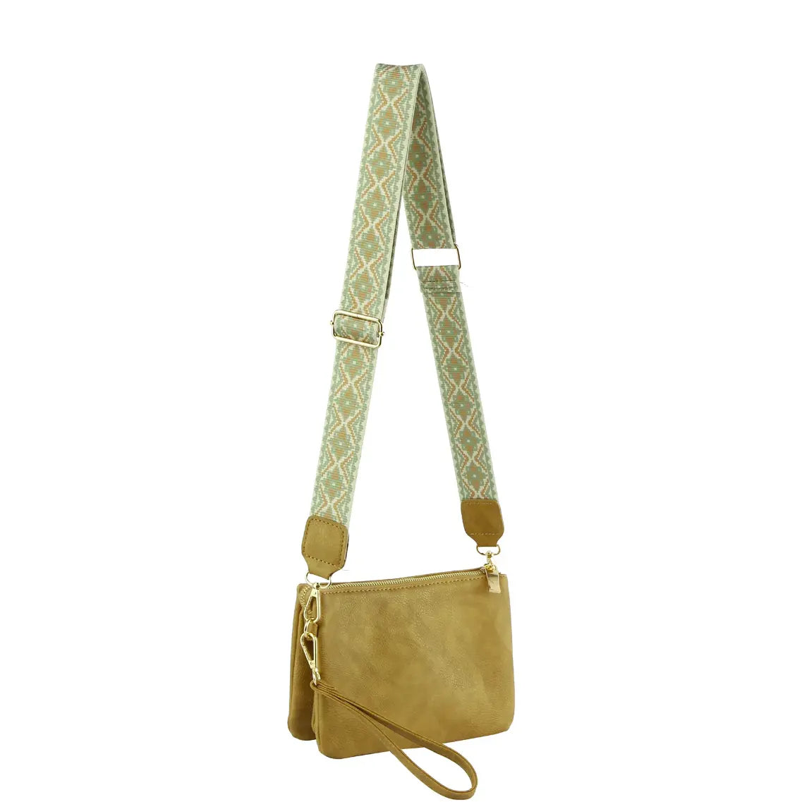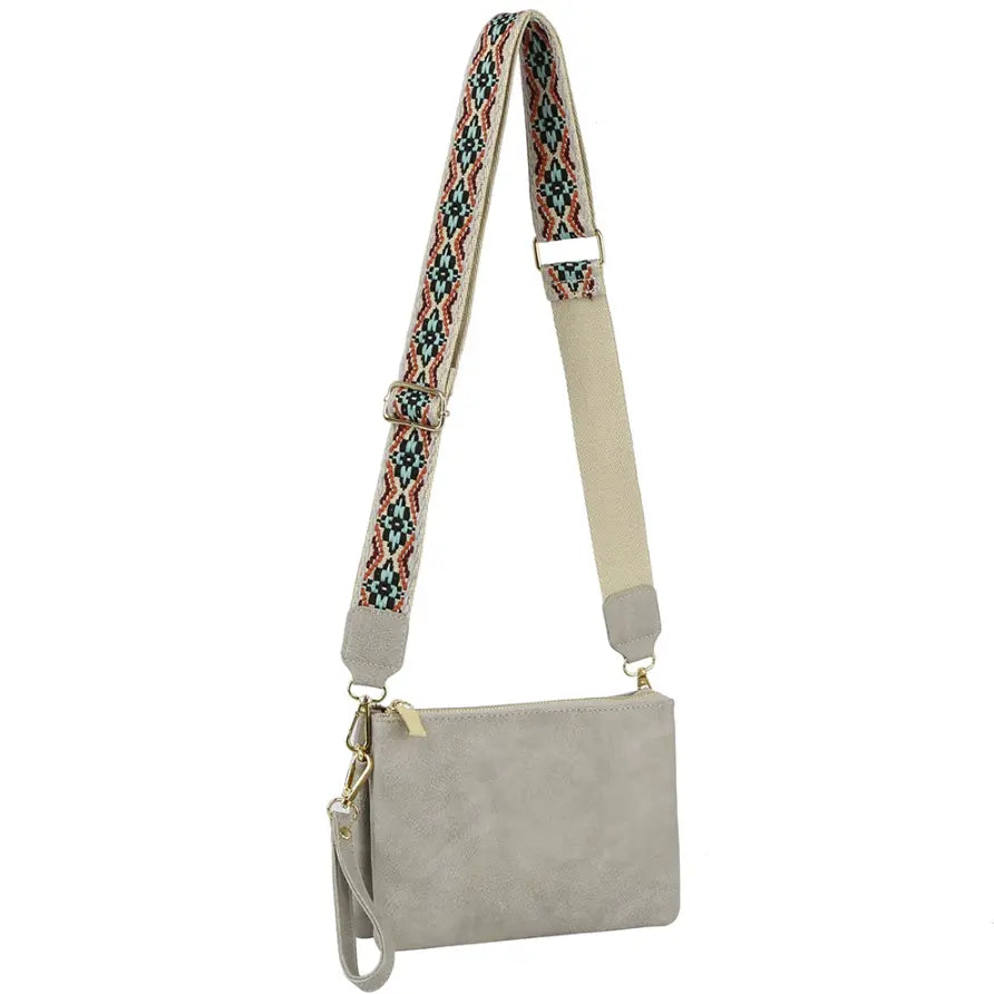 Elevate your style with our Multi Compartment Crossbody Bag! Crafted with faux vegan leather, zip top closure, and gold-tone hardware, this bag offers both function and fashion. The detachable and adjustable shoulder strap adds versatility, while the Aztec pattern guitar strap adds a unique touch. L 8.8 * H 6.1 * W 2.5.