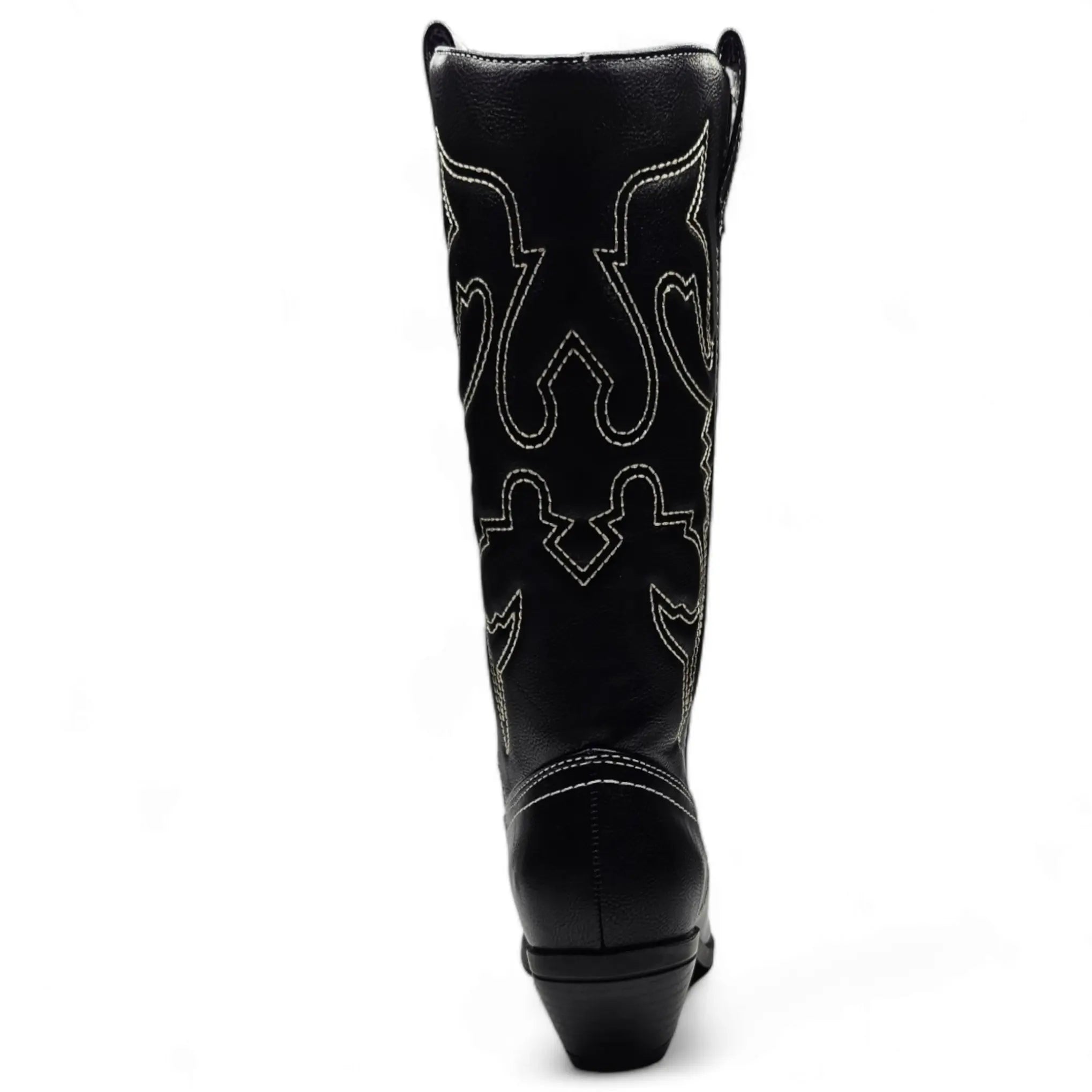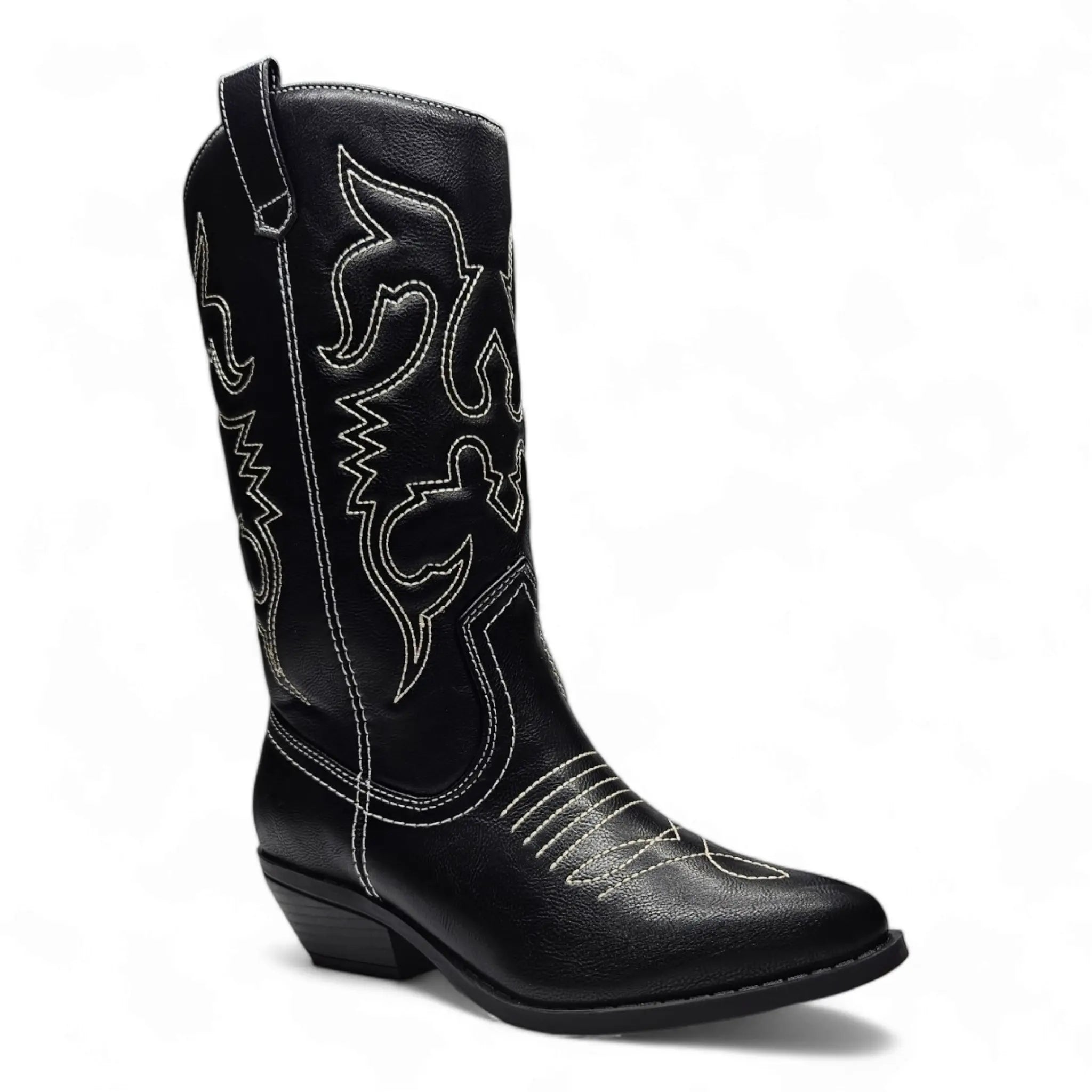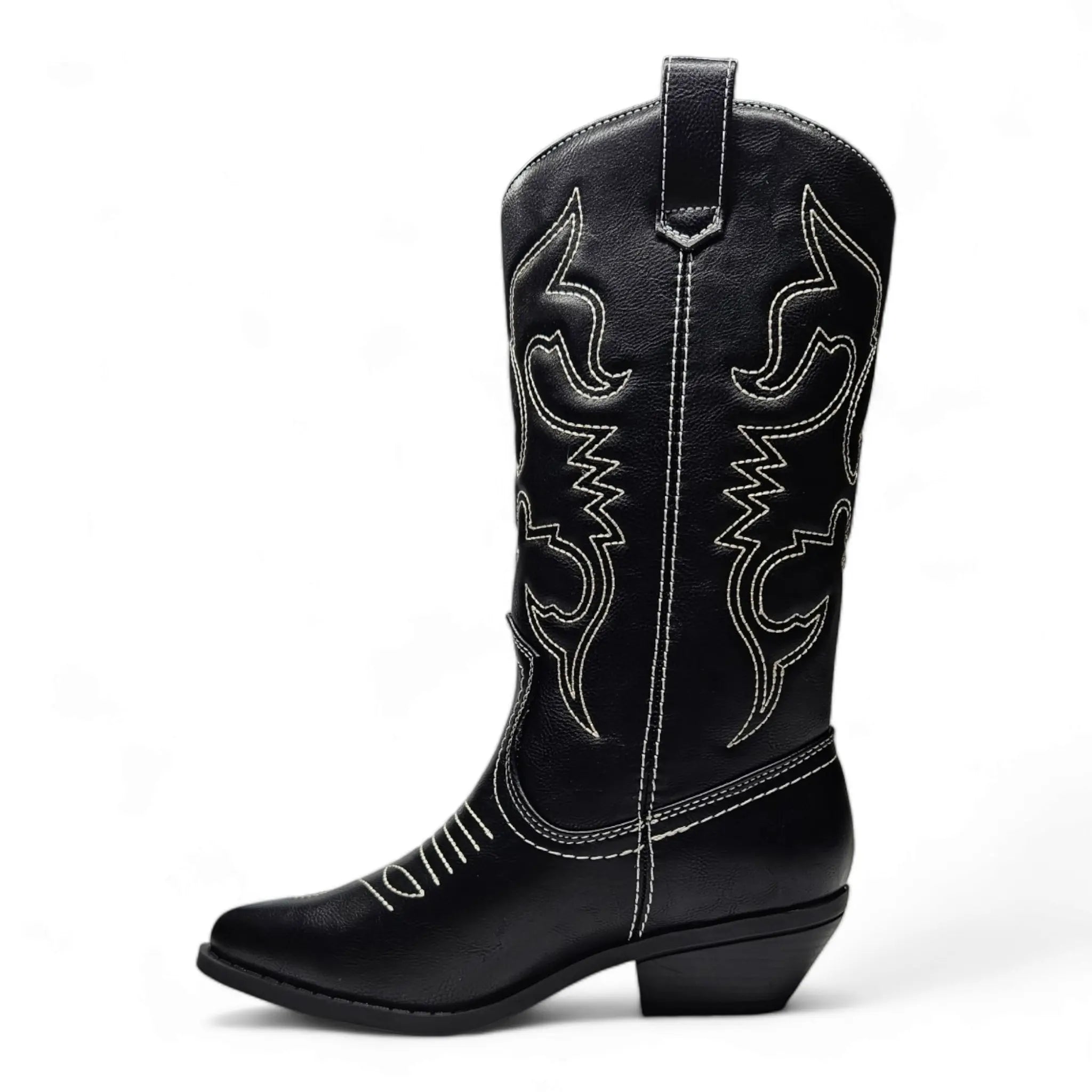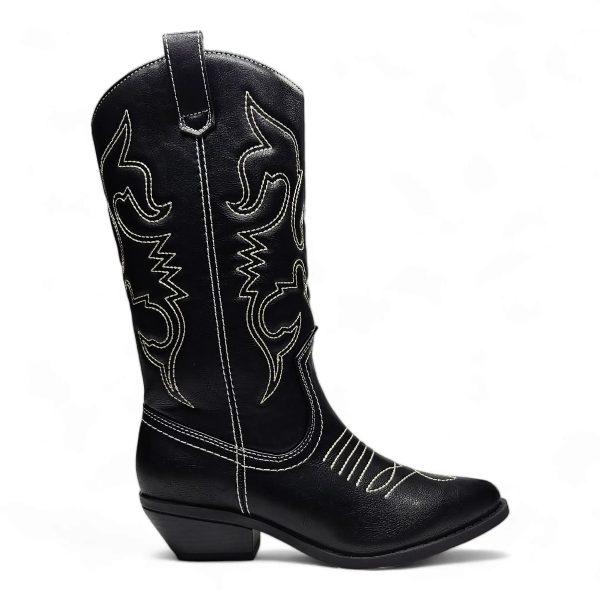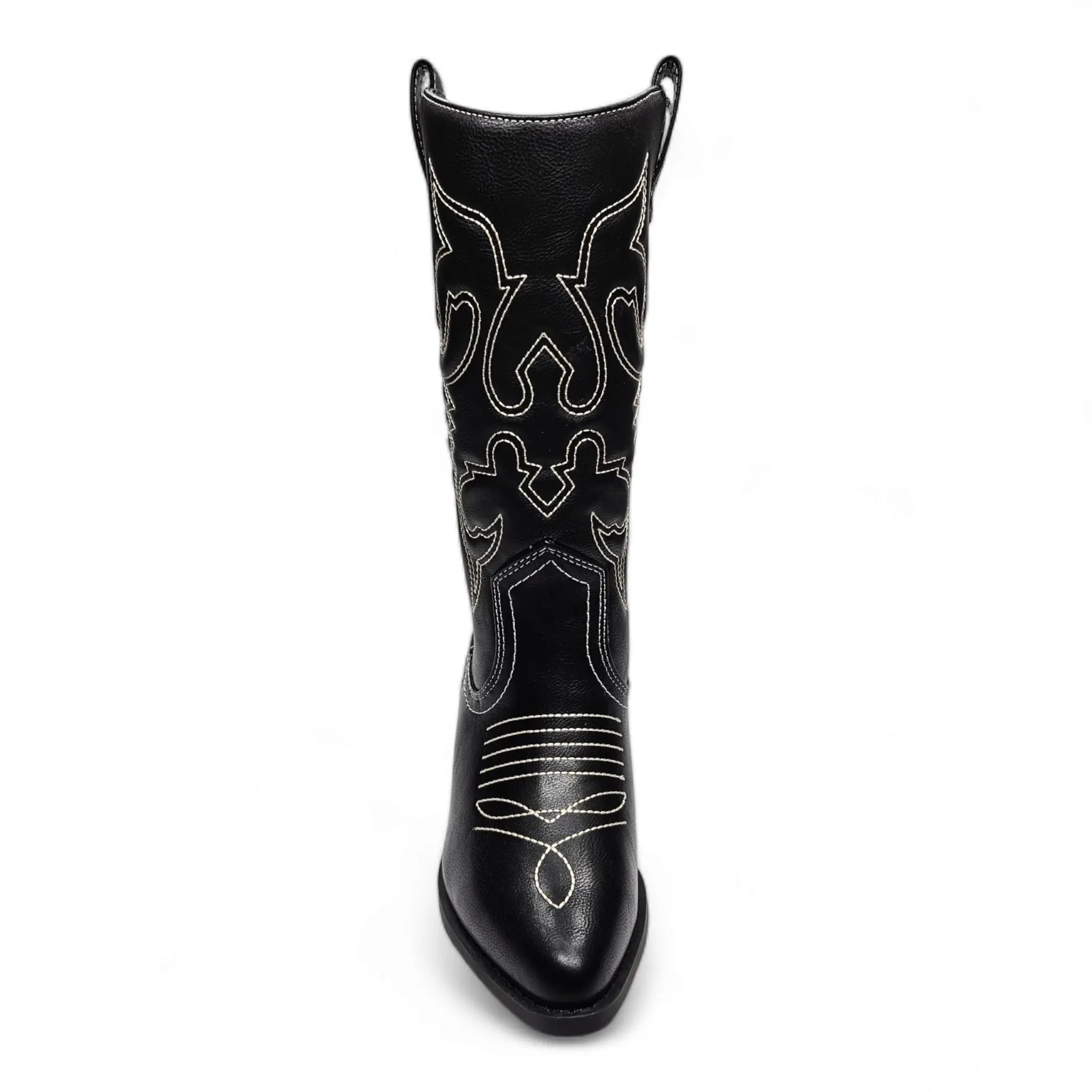 These Rerun Cowboy Boots offer classic western style with a modern twist. The pointed toe silhouette is crafted from faux leather, offering a stylish look with durable construction. Perfect for a night out or a casual day, these boots will soon become your go-to style.