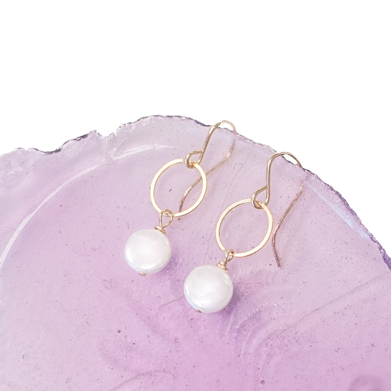 Part of our $25 collection, either one of these are the perfect neutral small earring. Purple Pearl has colors of blues, purples, and pinks to create a pretty iridescent coloring. White Pearl is actually a "shell pearl" flast disc.