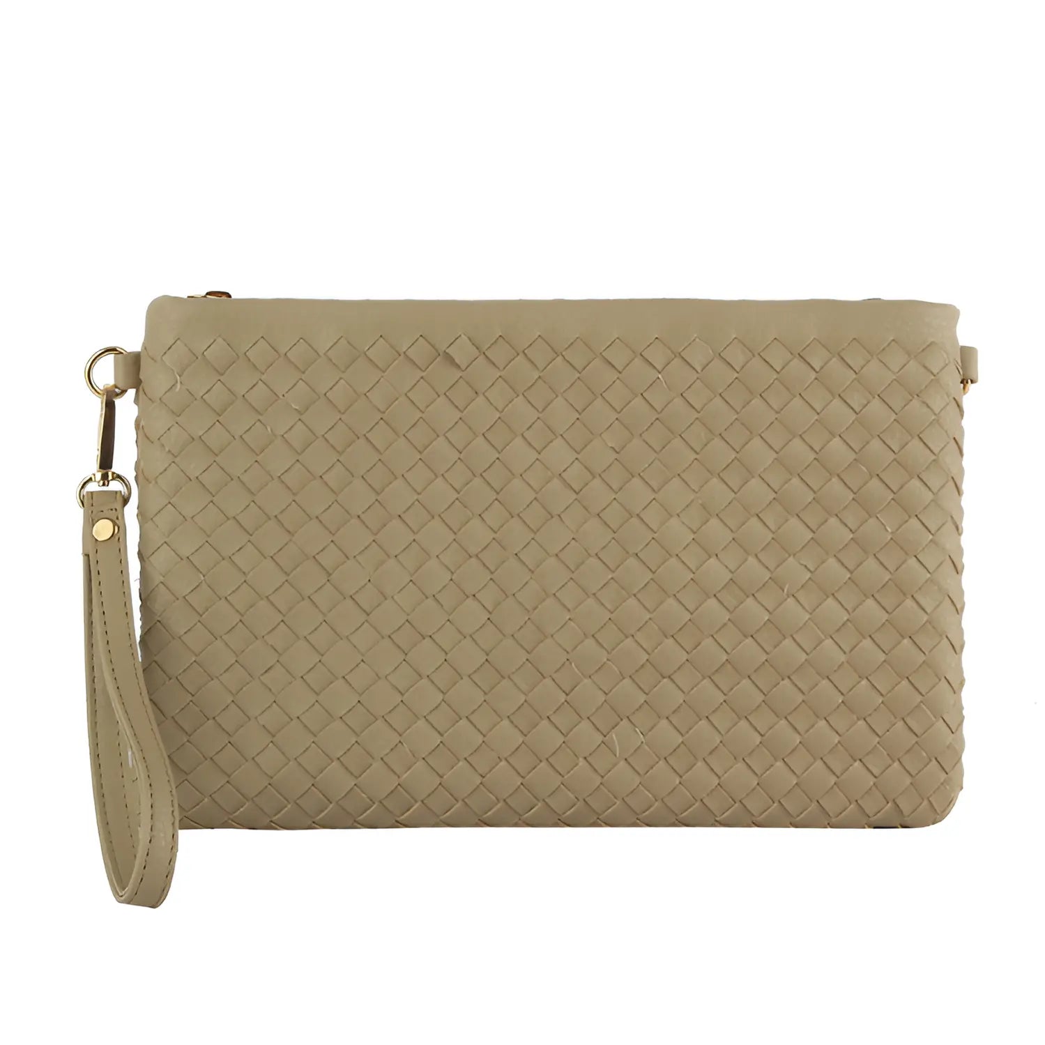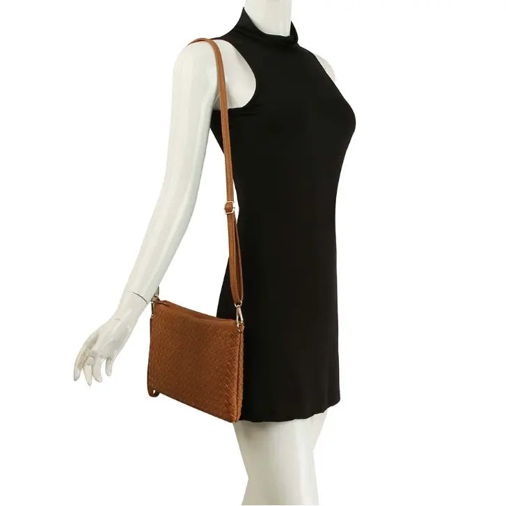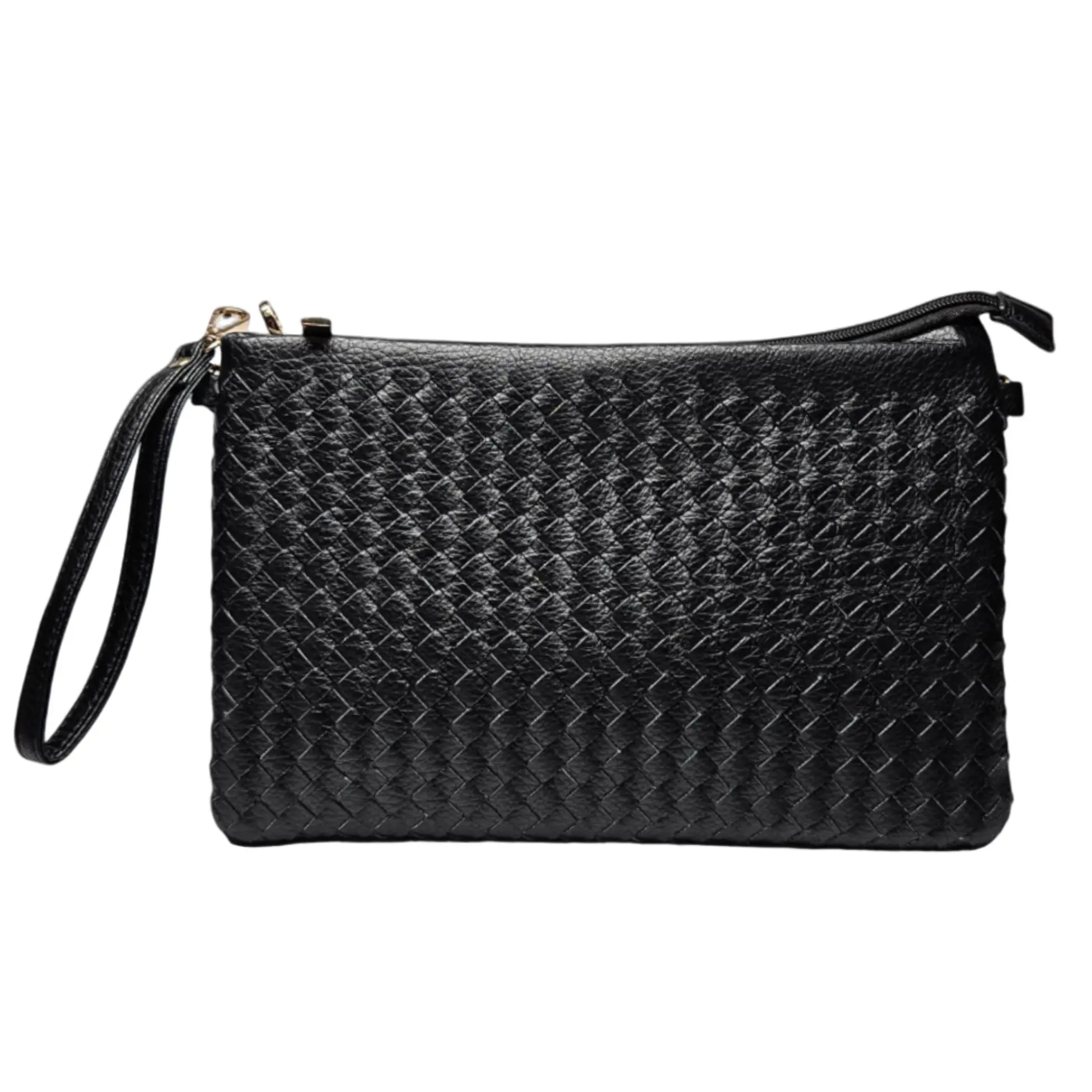 Elevate your style with our chic Woven Clutch Crossbody Bag! Crafted from high-quality faux leather, this bag features a convenient push-lock and zip top closure. The gold-tone hardware adds a touch of luxury, and the detachable shoulder strap and wrist band offer versatility. Perfectly sized at L 11.5 x H 7 x W 1.5, it's the ideal bag for any occasion.