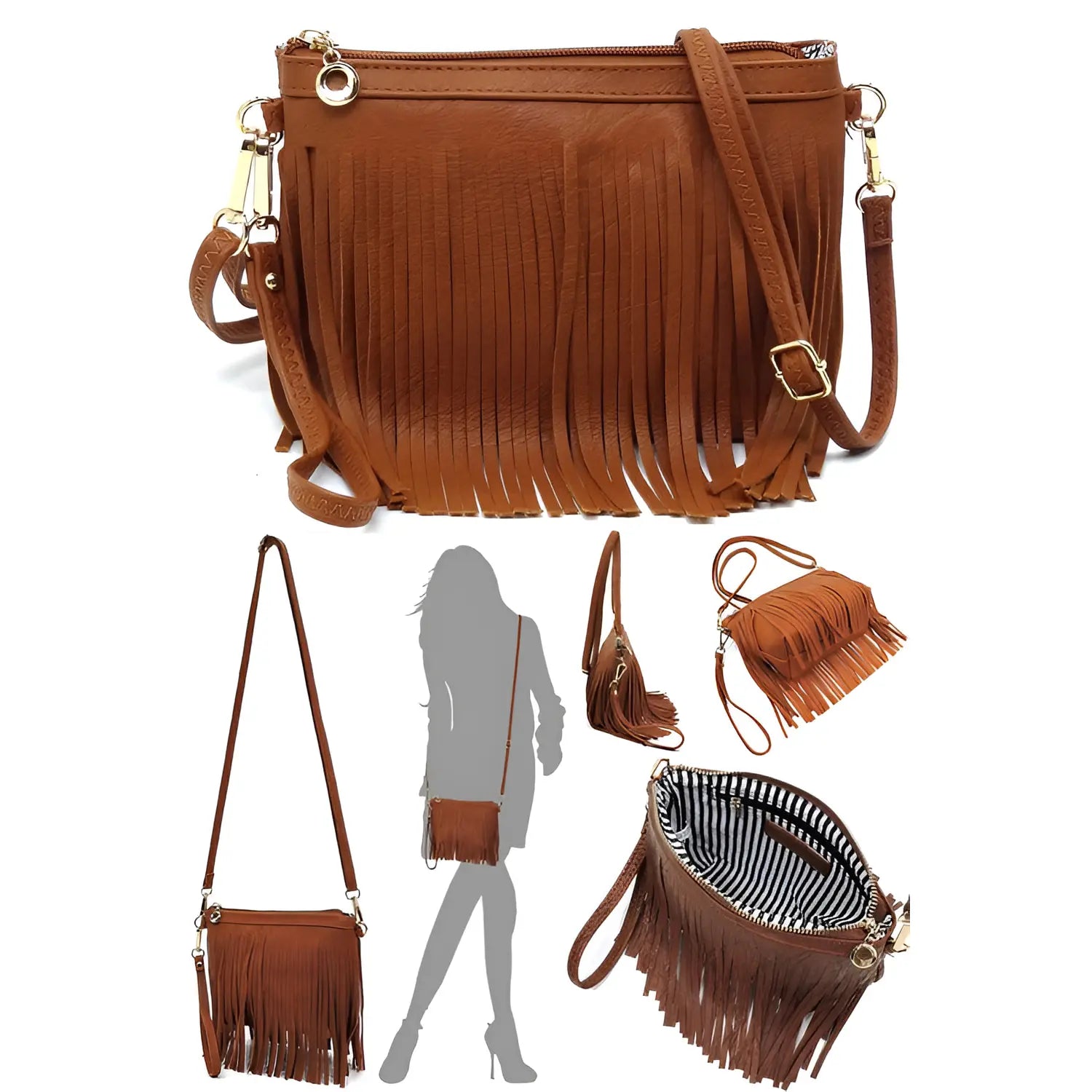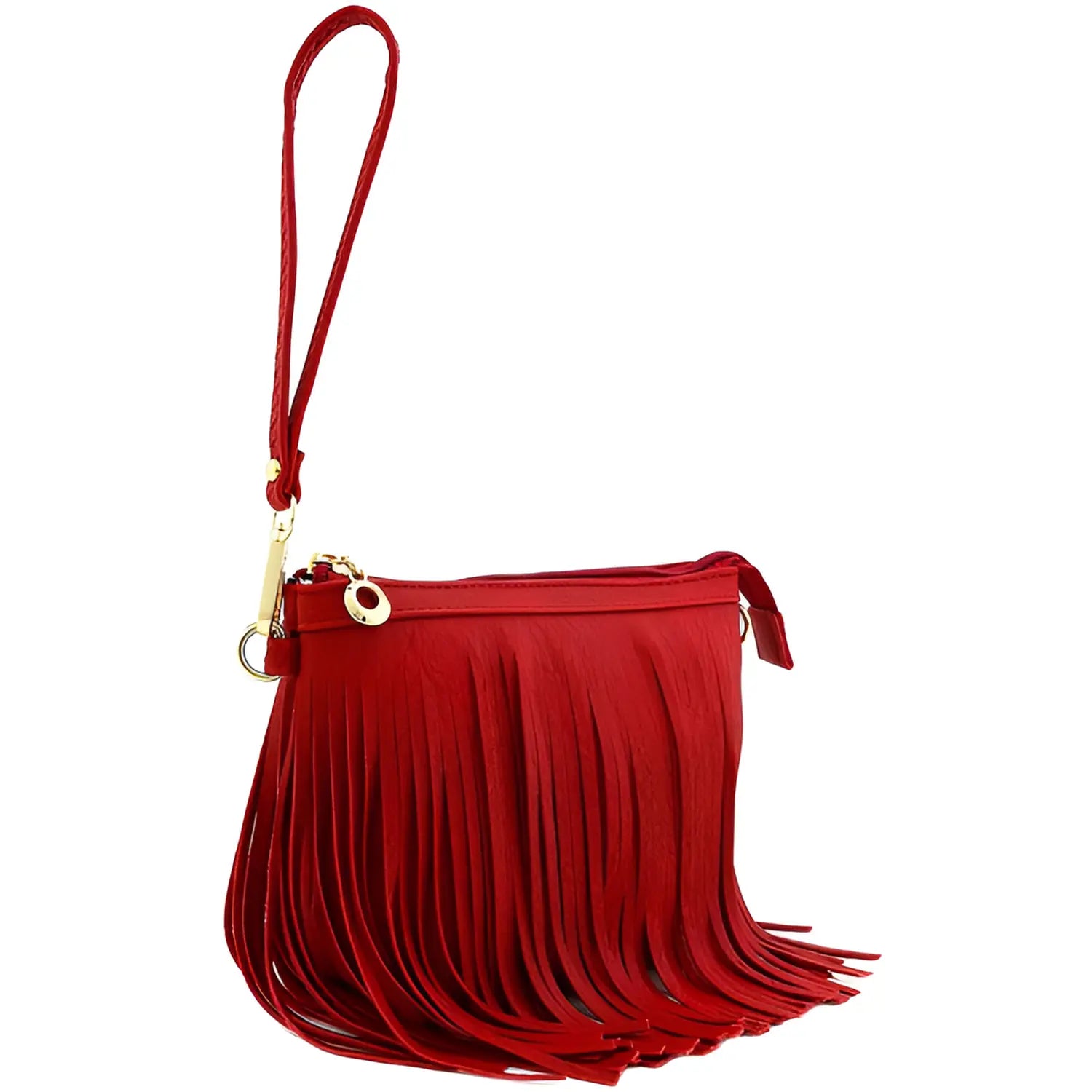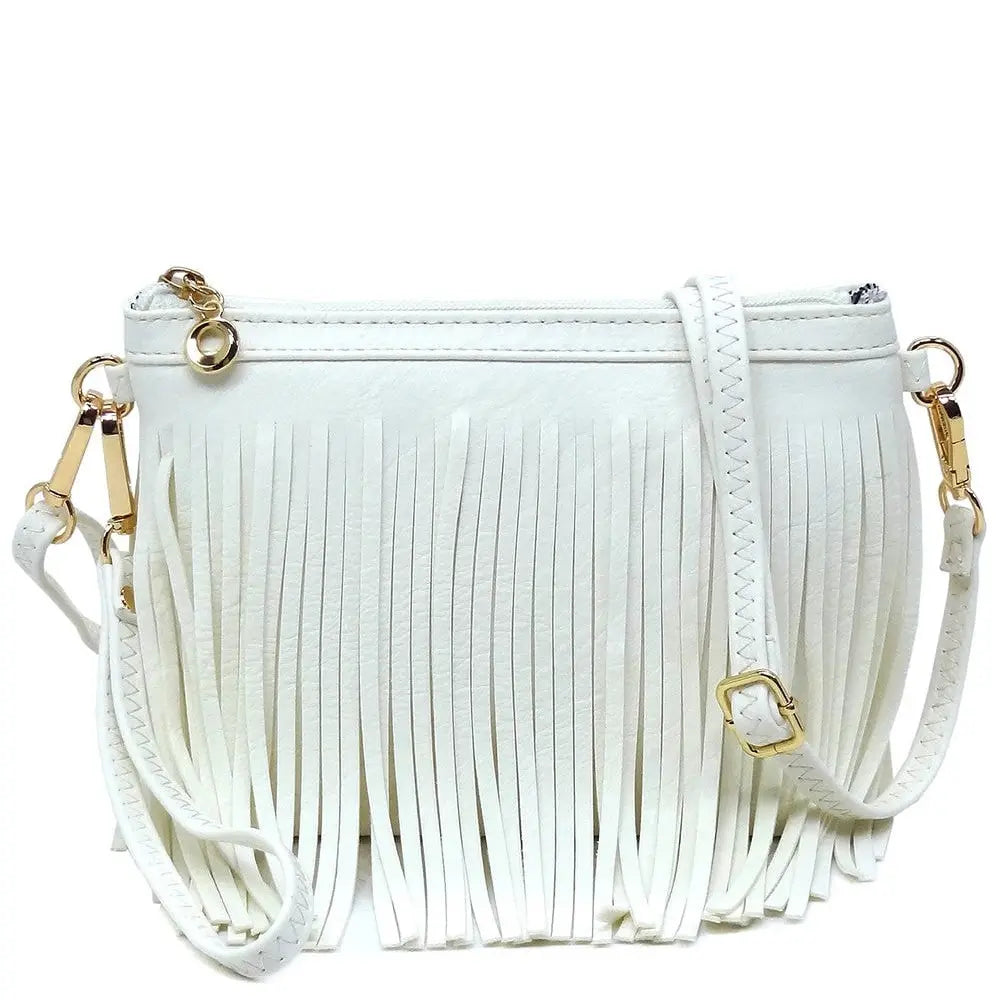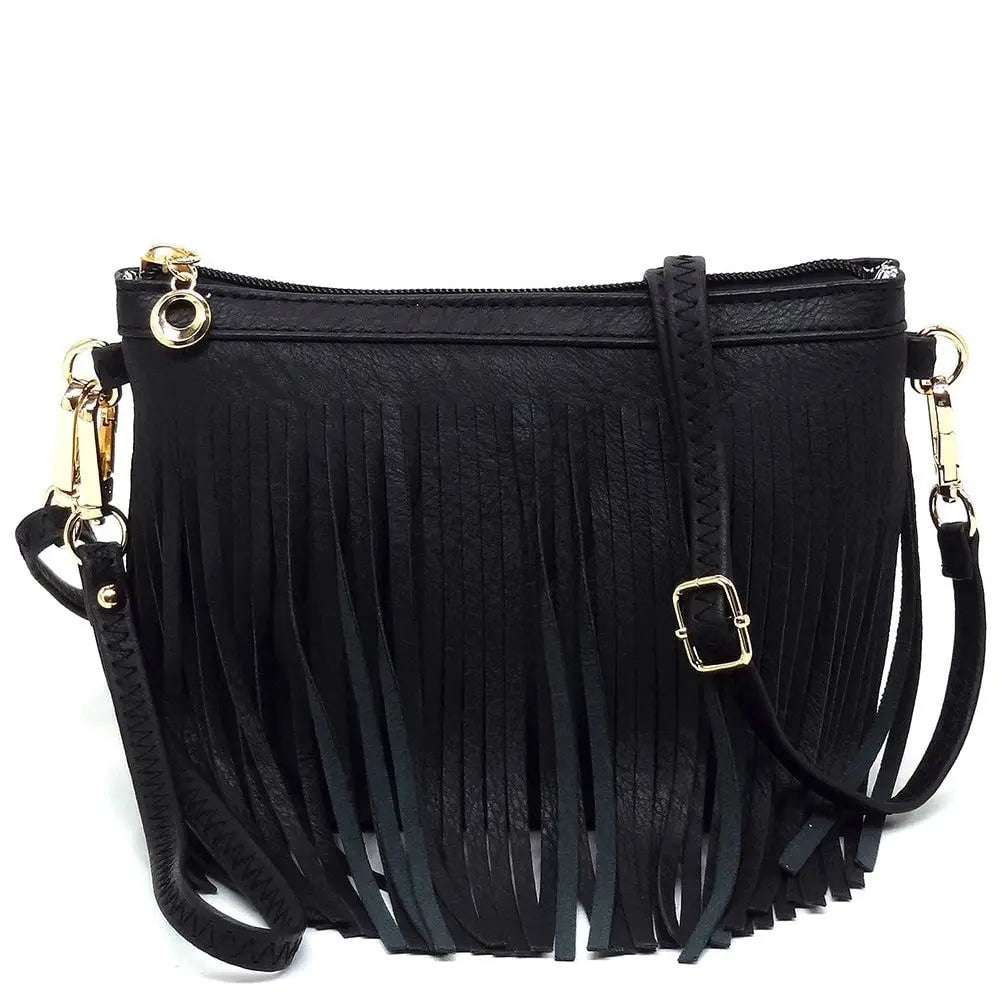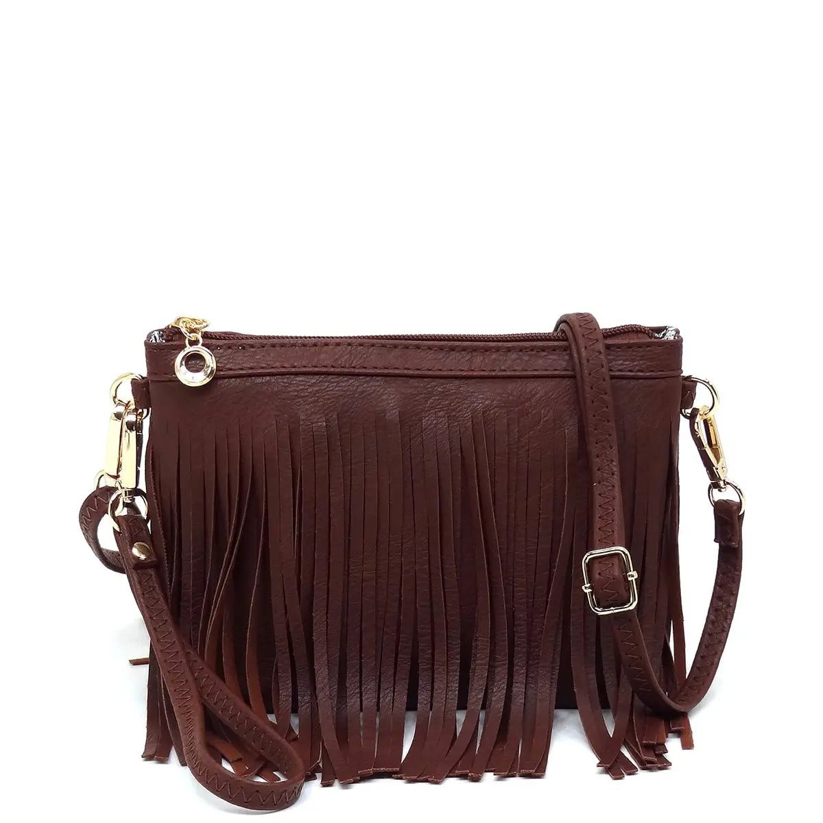 Elevate your style with our Fringe Crossbody bag! Crafted from faux leather with Western-inspired fringe detailing, this versatile bag features a zip top closure for secure storage. Plus, with a detachable shoulder strap and wrist band, you can wear it as a crossbody or clutch for hands-free convenience. L 8.5 * H 6 * W 3.