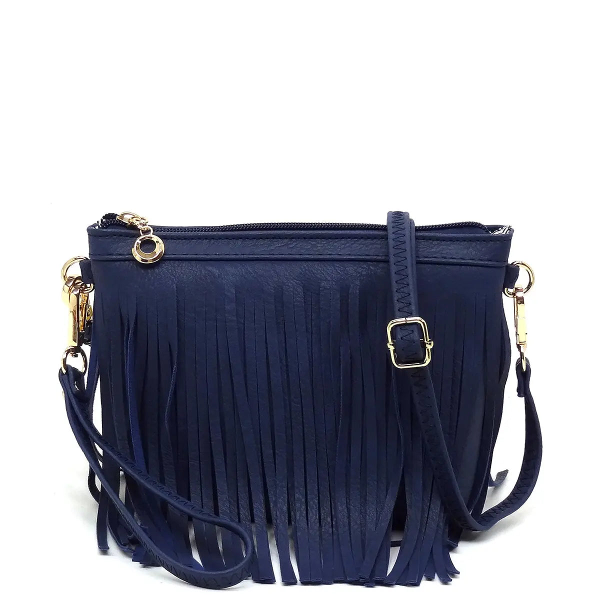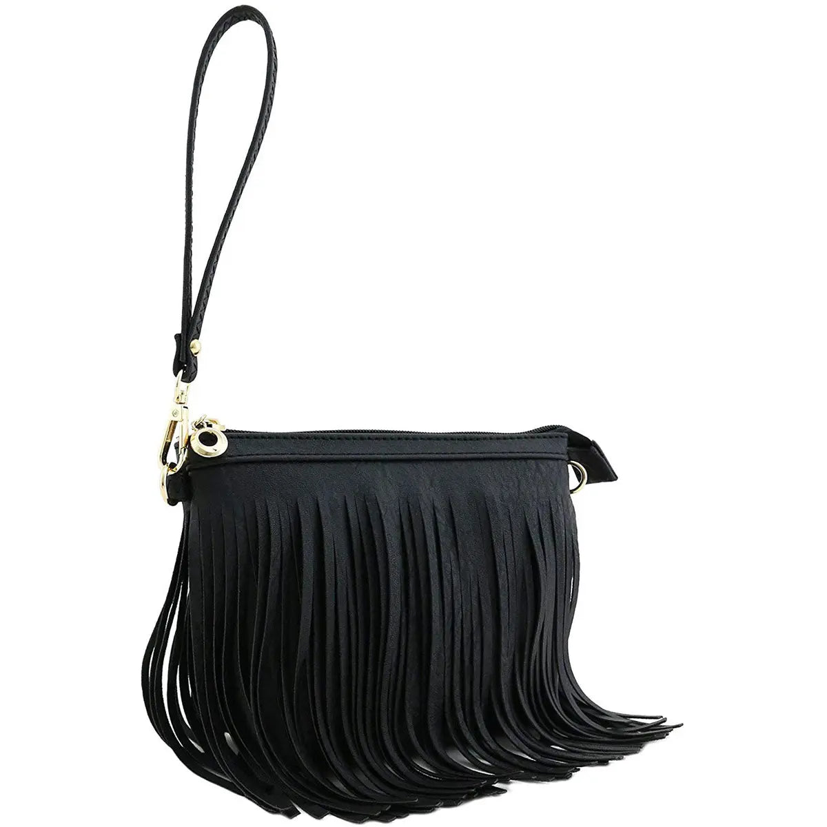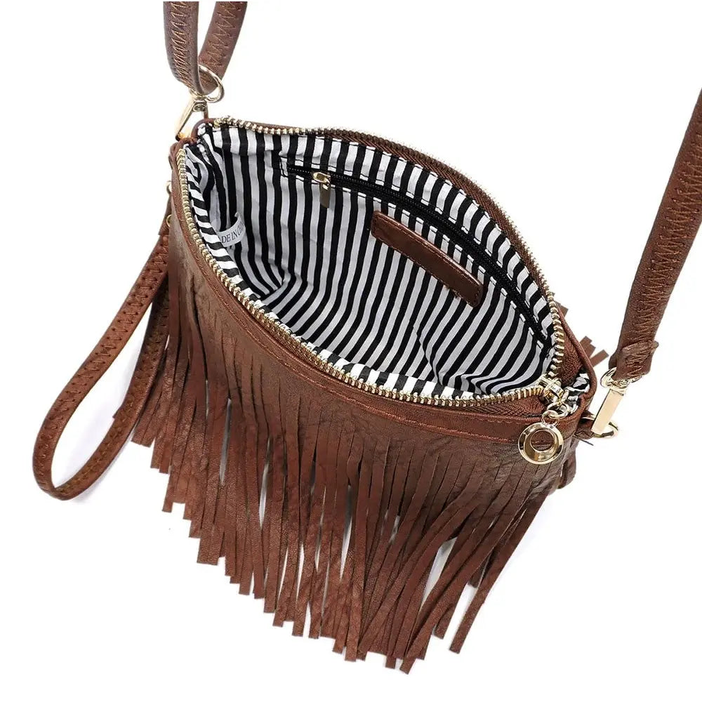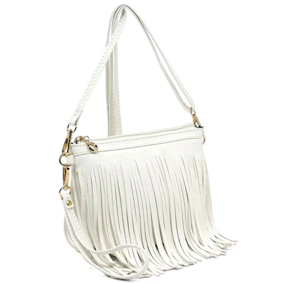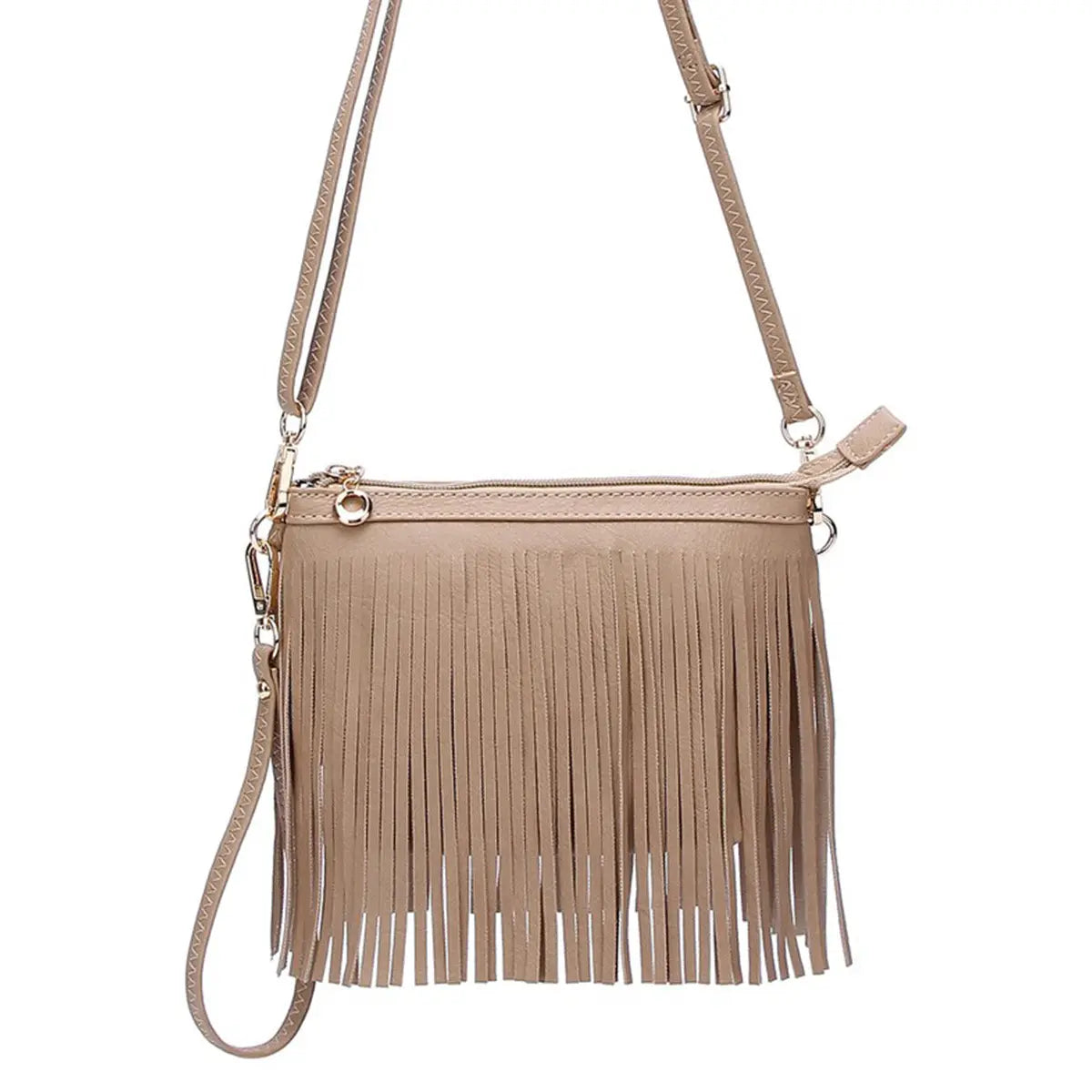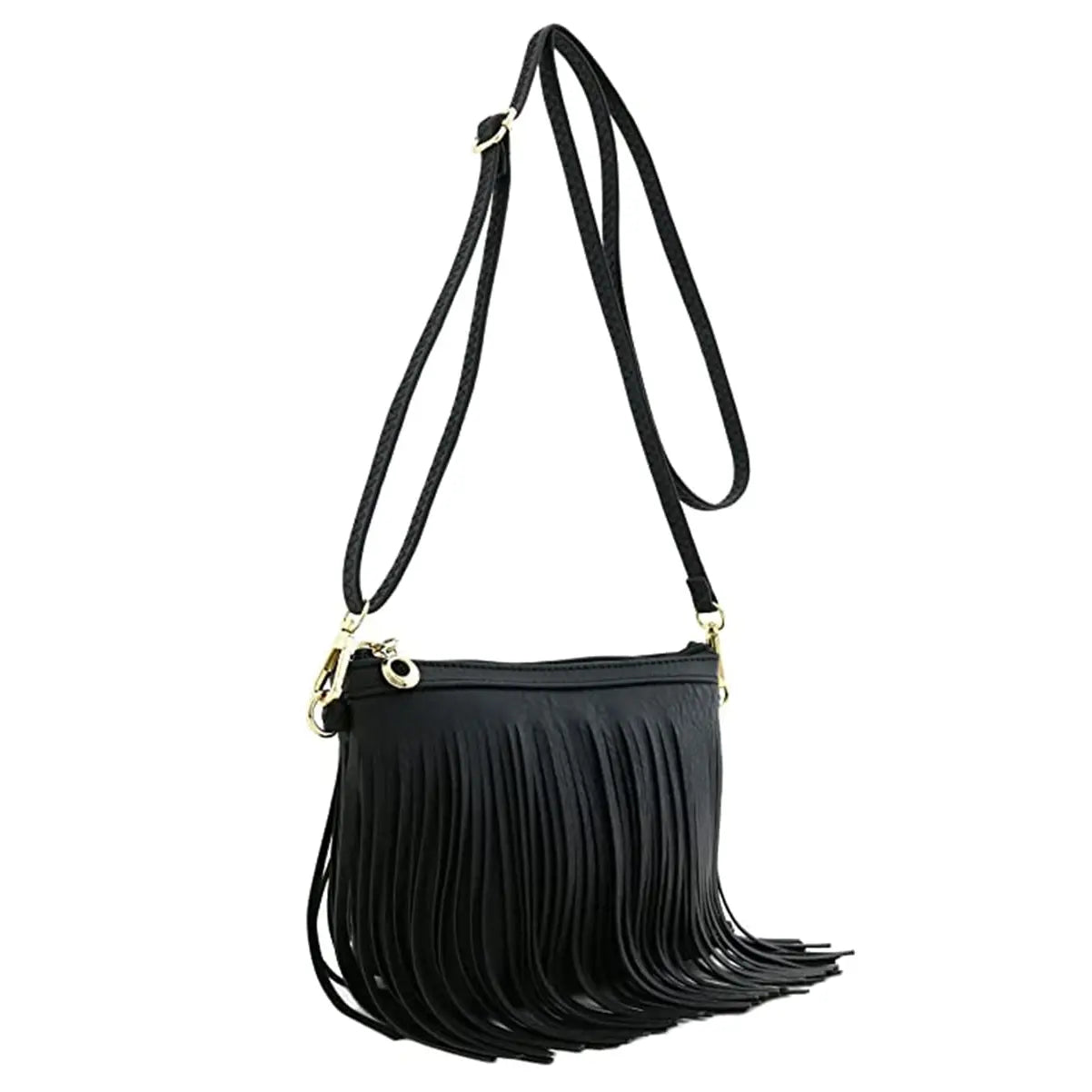 Elevate your style with our Fringe Crossbody bag! Crafted from faux leather with Western-inspired fringe detailing, this versatile bag features a zip top closure for secure storage. Plus, with a detachable shoulder strap and wrist band, you can wear it as a crossbody or clutch for hands-free convenience. L 8.5 * H 6 * W 3.