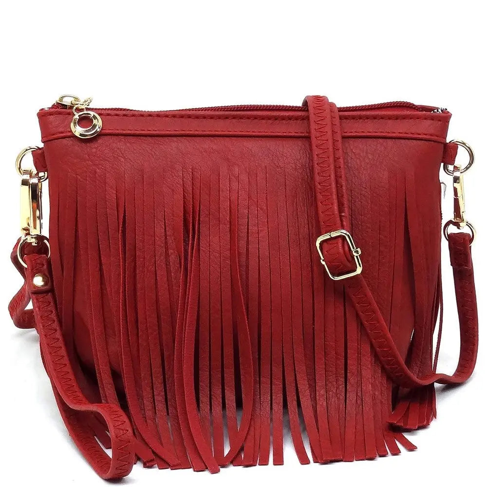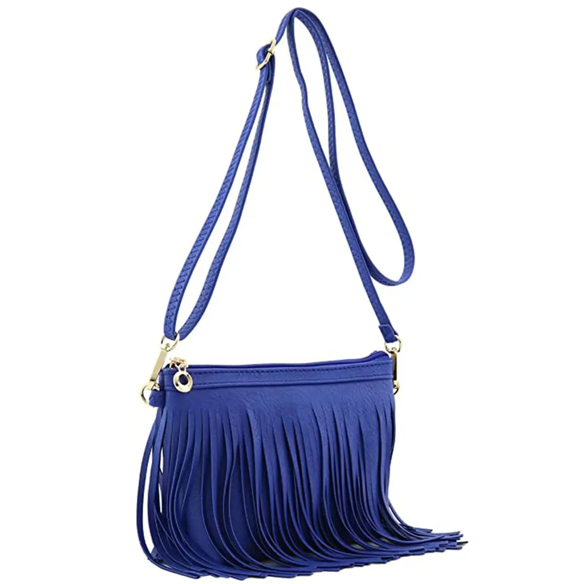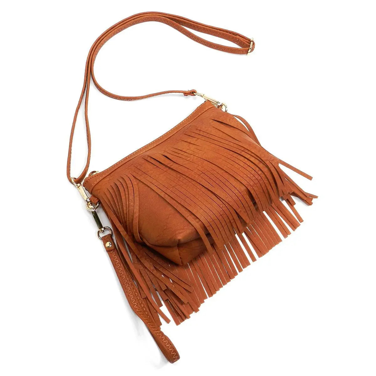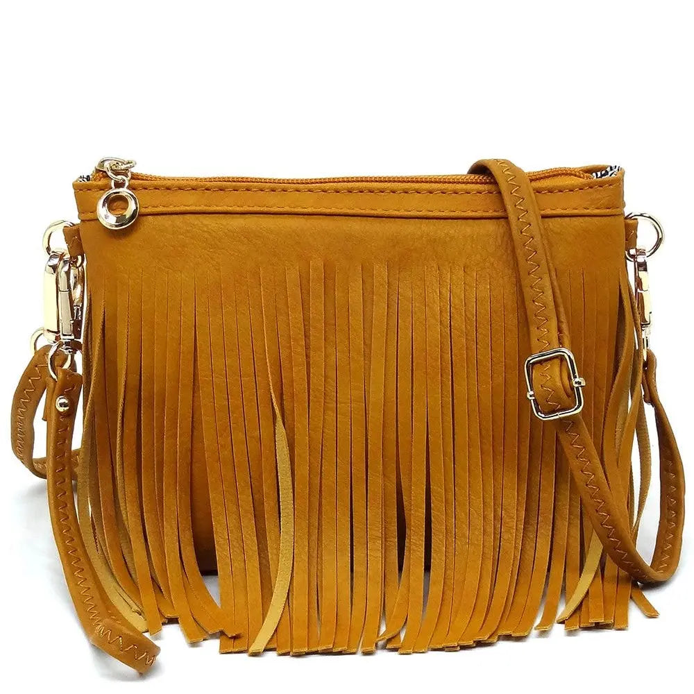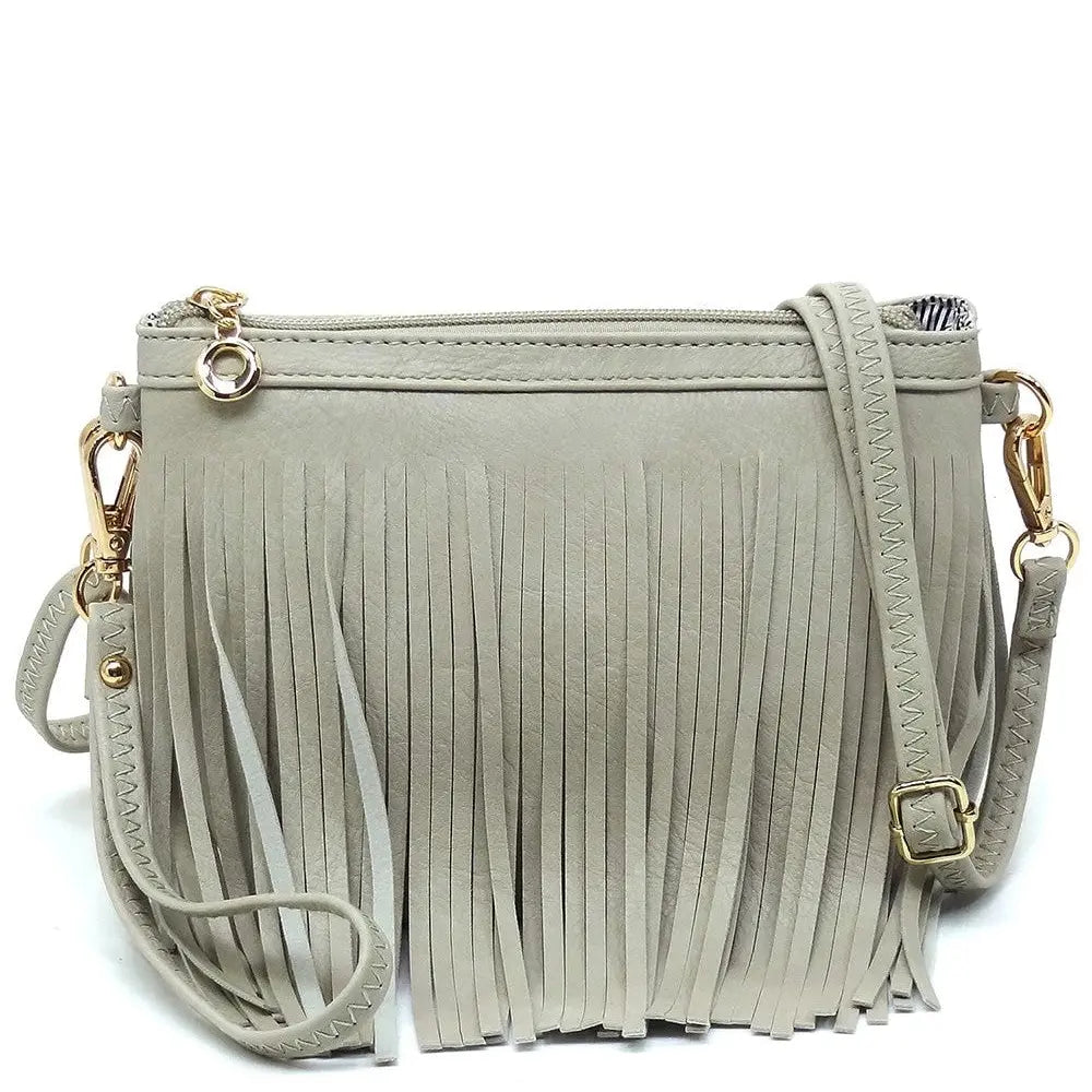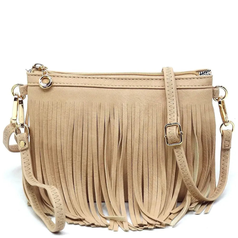 Elevate your style with our Fringe Crossbody bag! Crafted from faux leather with Western-inspired fringe detailing, this versatile bag features a zip top closure for secure storage. Plus, with a detachable shoulder strap and wrist band, you can wear it as a crossbody or clutch for hands-free convenience. L 8.5 * H 6 * W 3.