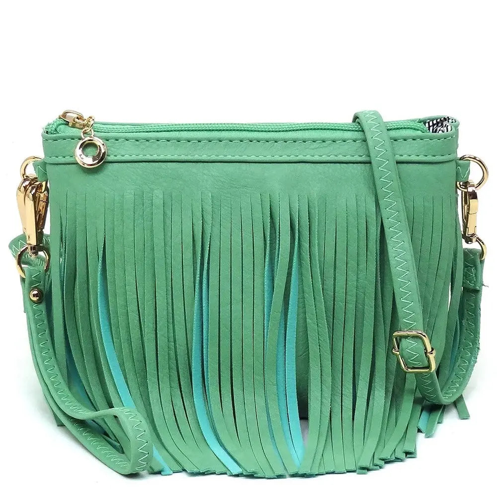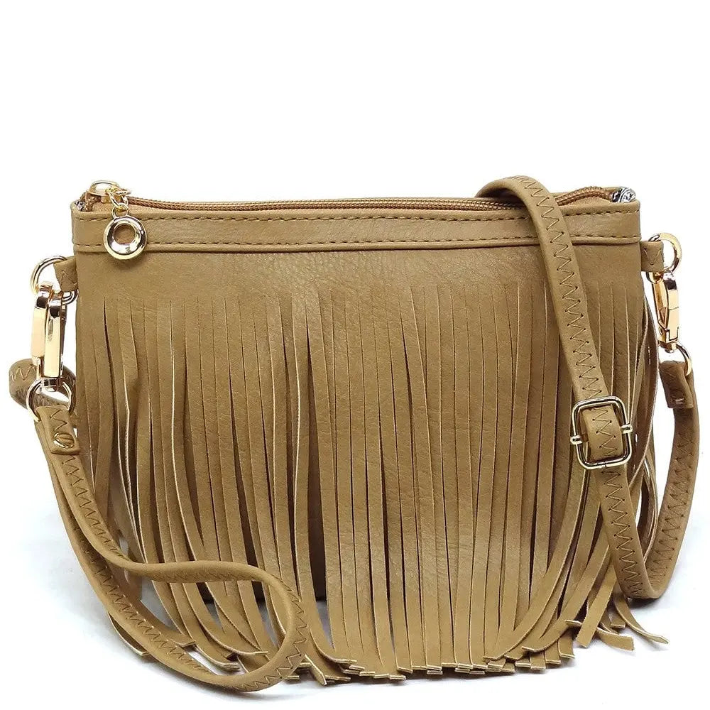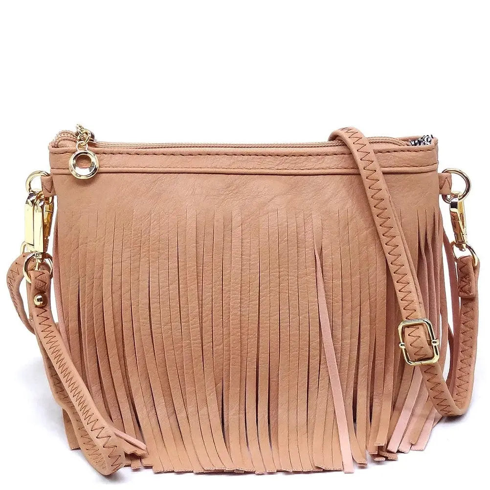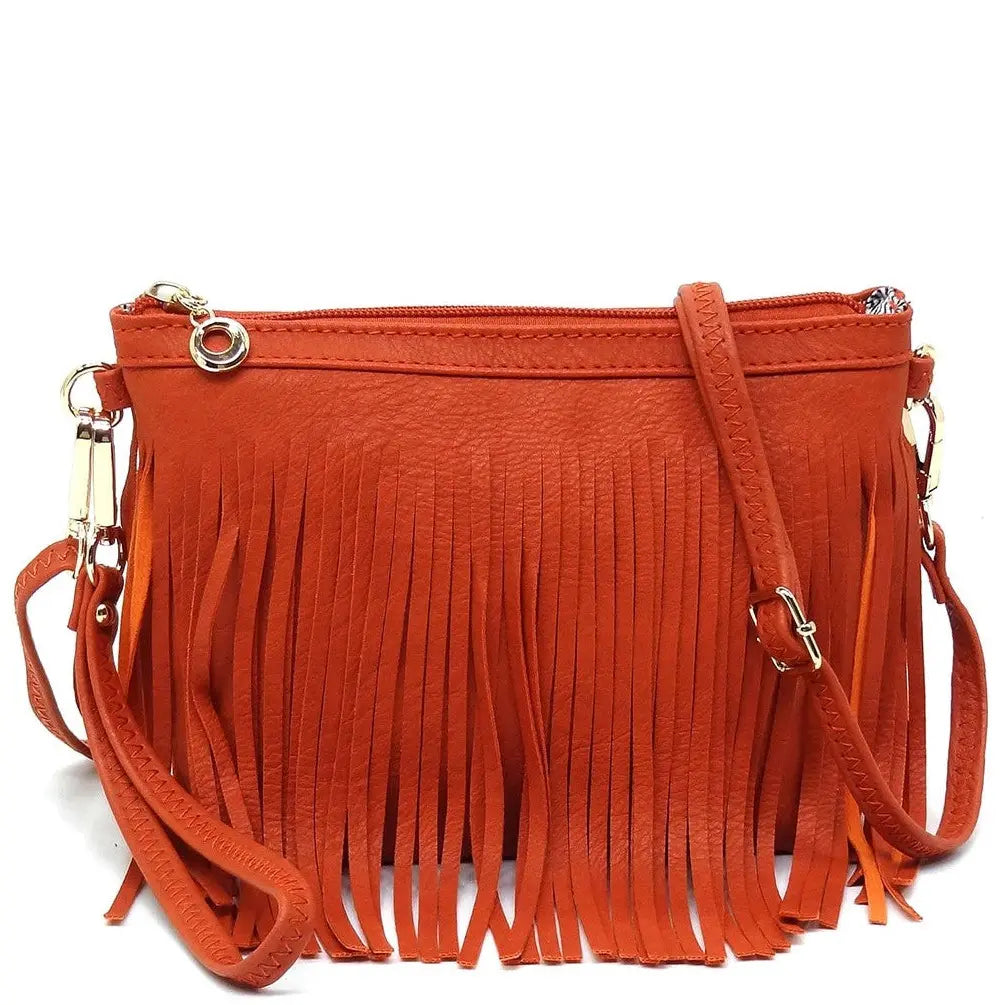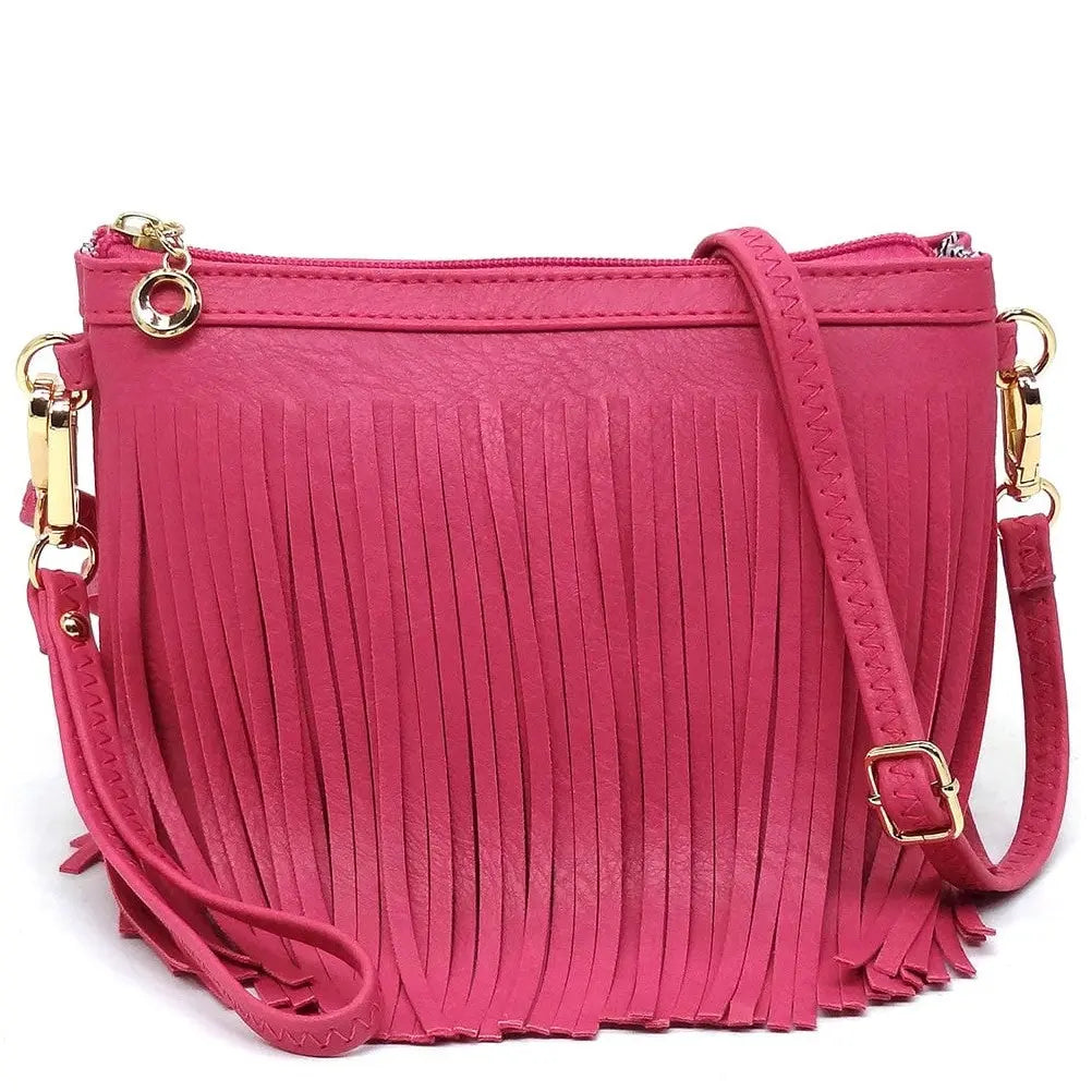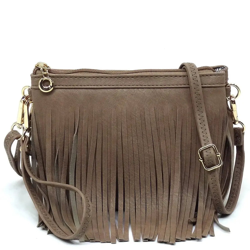 Elevate your style with our Fringe Crossbody bag! Crafted from faux leather with Western-inspired fringe detailing, this versatile bag features a zip top closure for secure storage. Plus, with a detachable shoulder strap and wrist band, you can wear it as a crossbody or clutch for hands-free convenience. L 8.5 * H 6 * W 3.