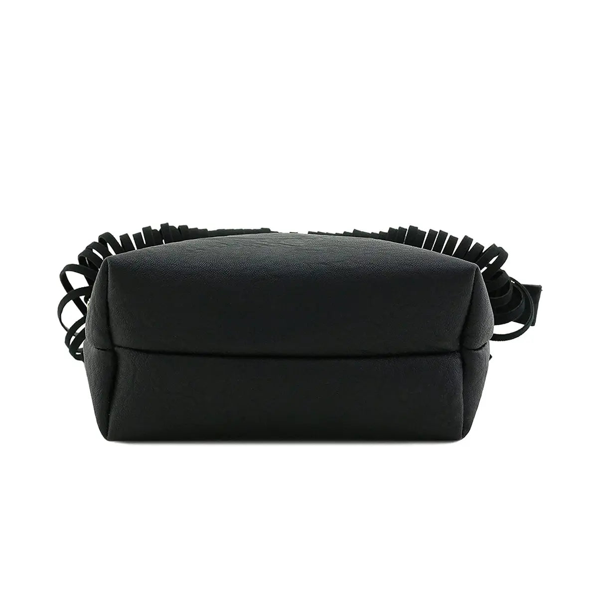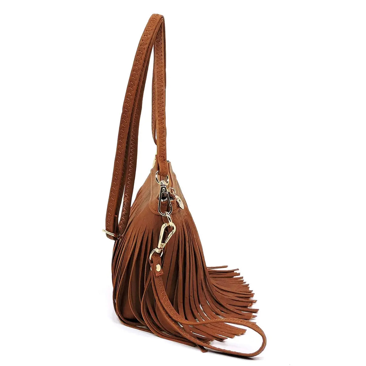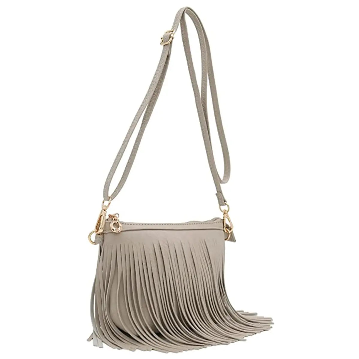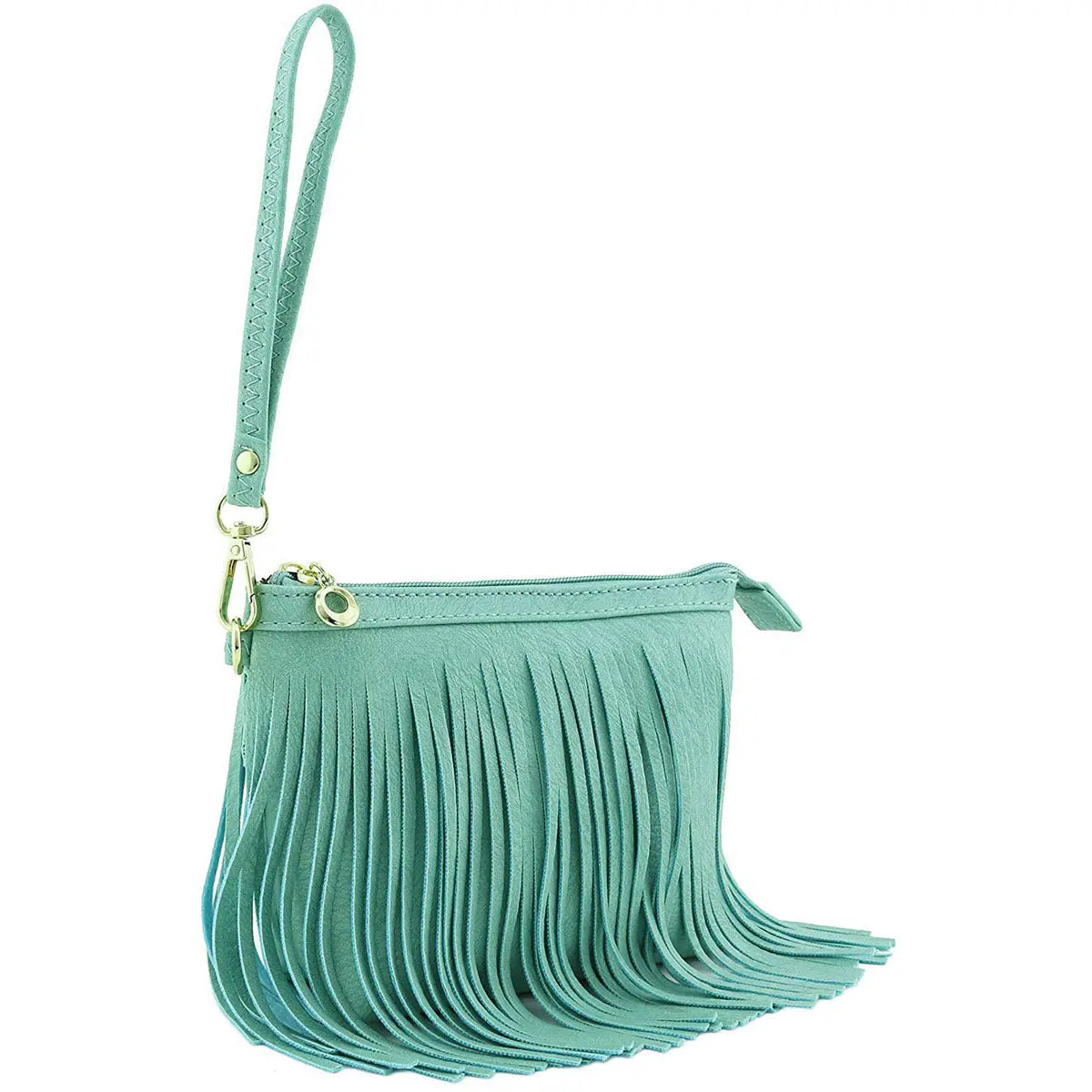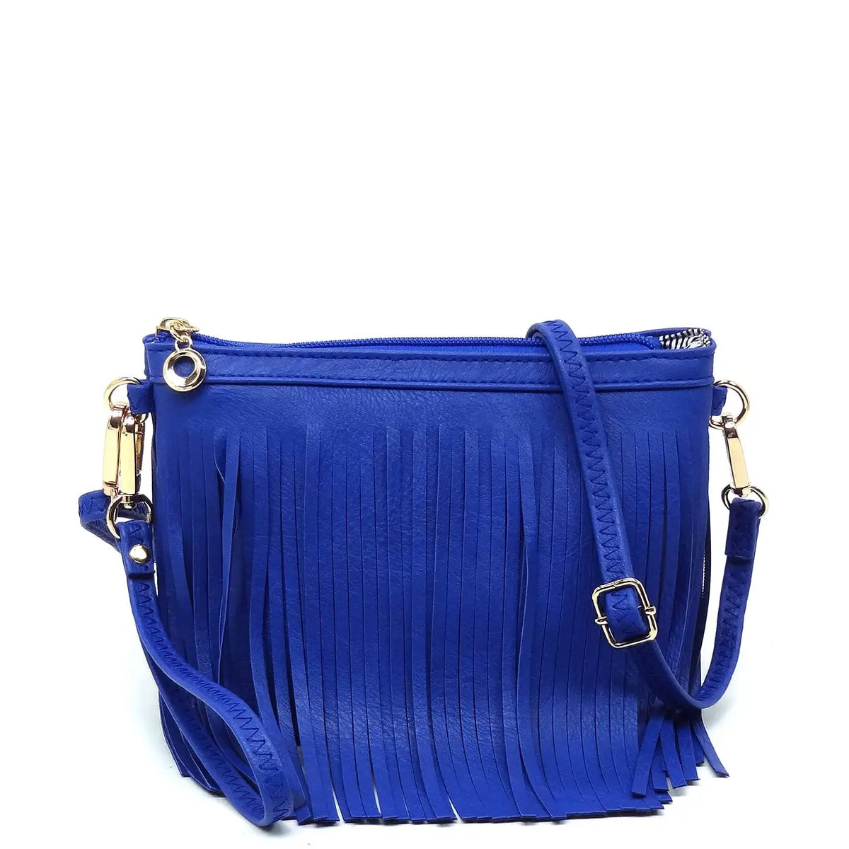 Elevate your style with our Fringe Crossbody bag! Crafted from faux leather with Western-inspired fringe detailing, this versatile bag features a zip top closure for secure storage. Plus, with a detachable shoulder strap and wrist band, you can wear it as a crossbody or clutch for hands-free convenience. L 8.5 * H 6 * W 3.