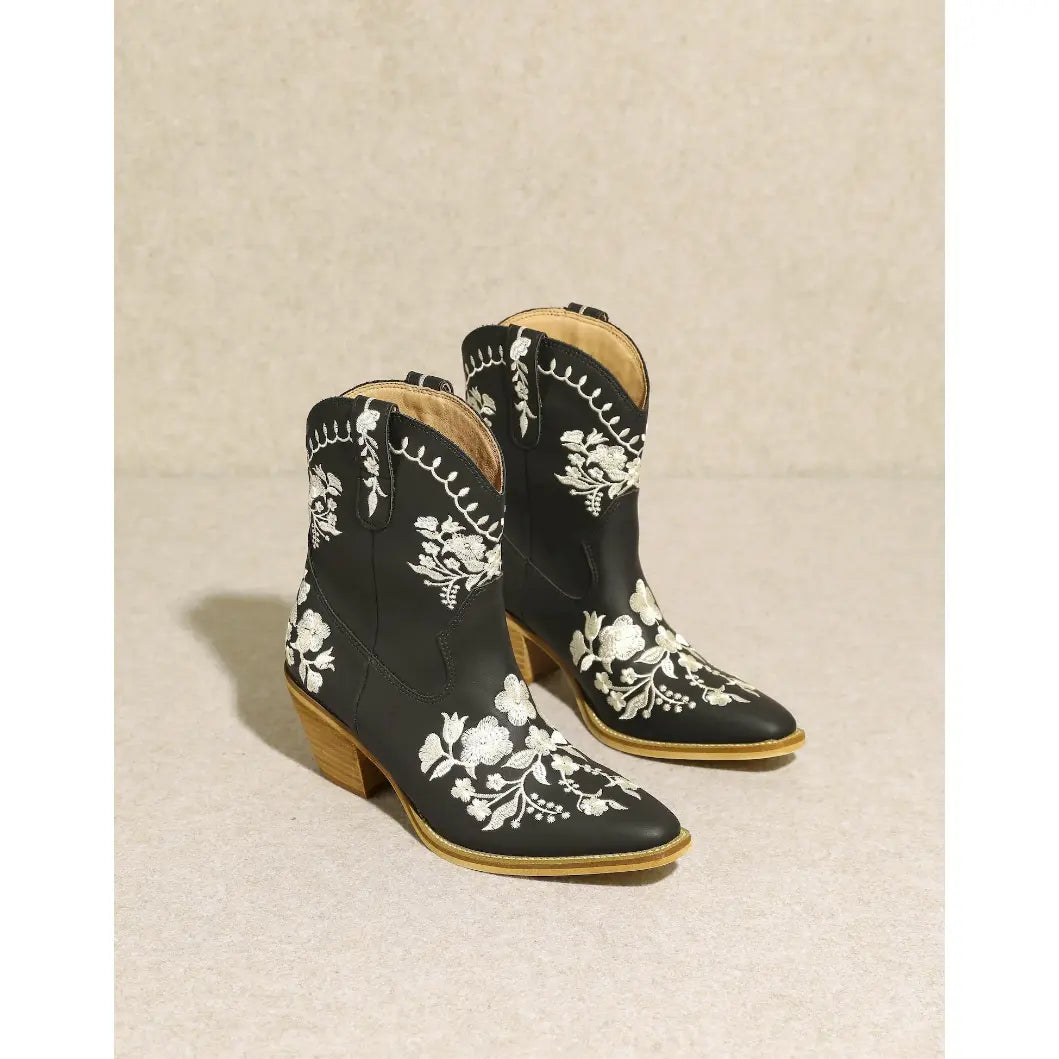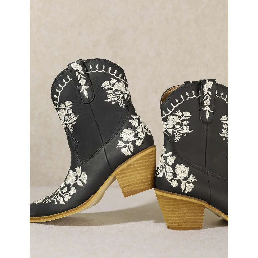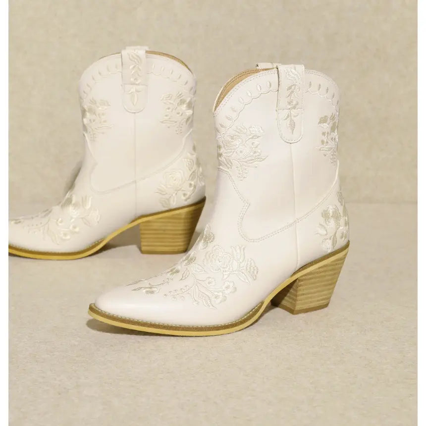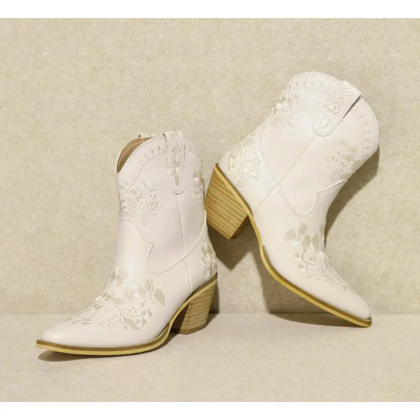 The Carolina Flora Cowgirl Bootie is a classic point toe shoe with an eye-catching corral flora design, perfect for any season. Its western-style adds a bold touch to any outfit, whether styled with a flowing skirt or dressed down with jeans. Make a statement with this versatile and chic shoe.