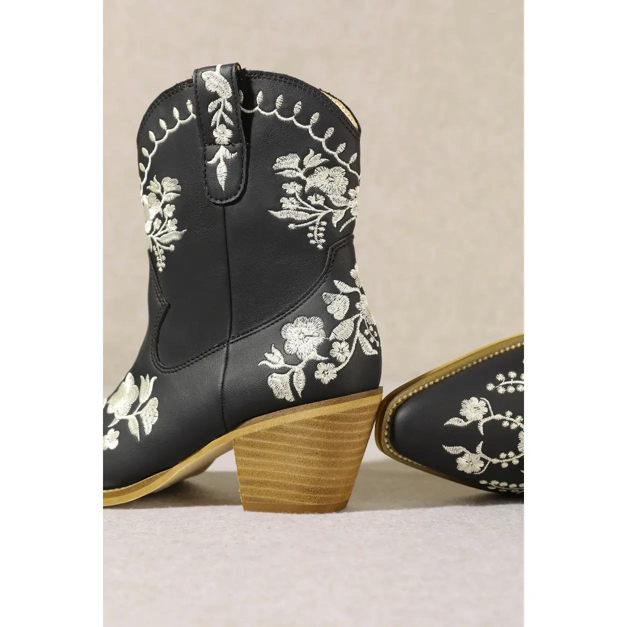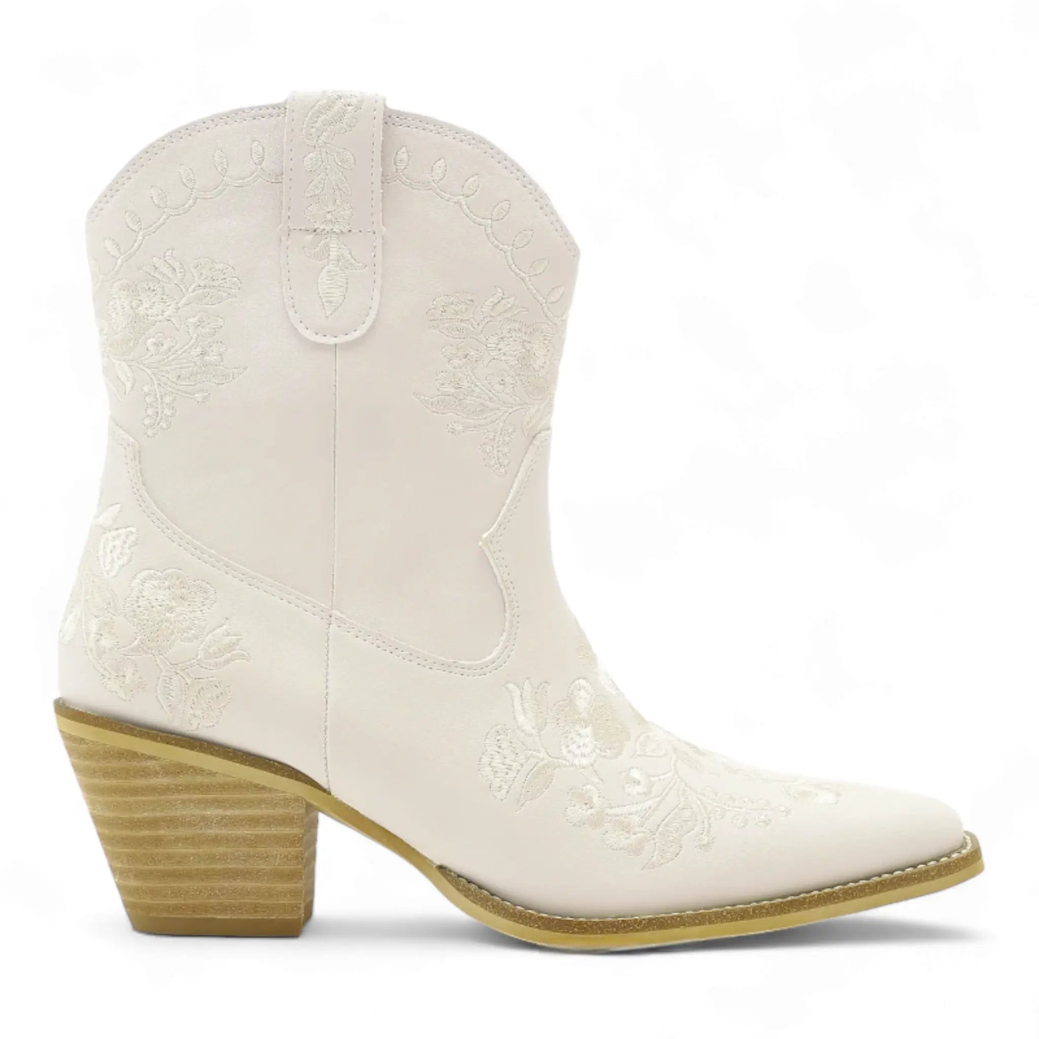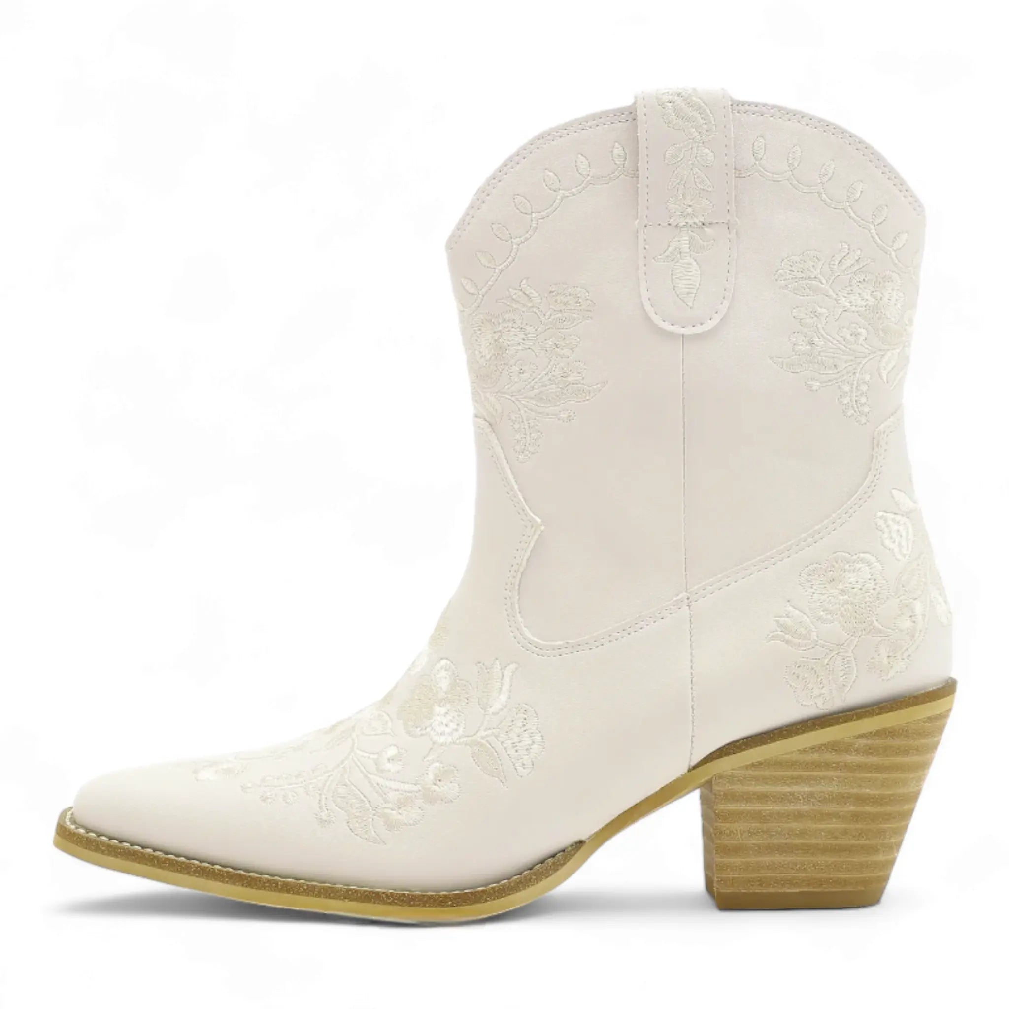 The Carolina Flora Cowgirl Bootie is a classic point toe shoe with an eye-catching corral flora design, perfect for any season. Its western-style adds a bold touch to any outfit, whether styled with a flowing skirt or dressed down with jeans. Make a statement with this versatile and chic shoe.