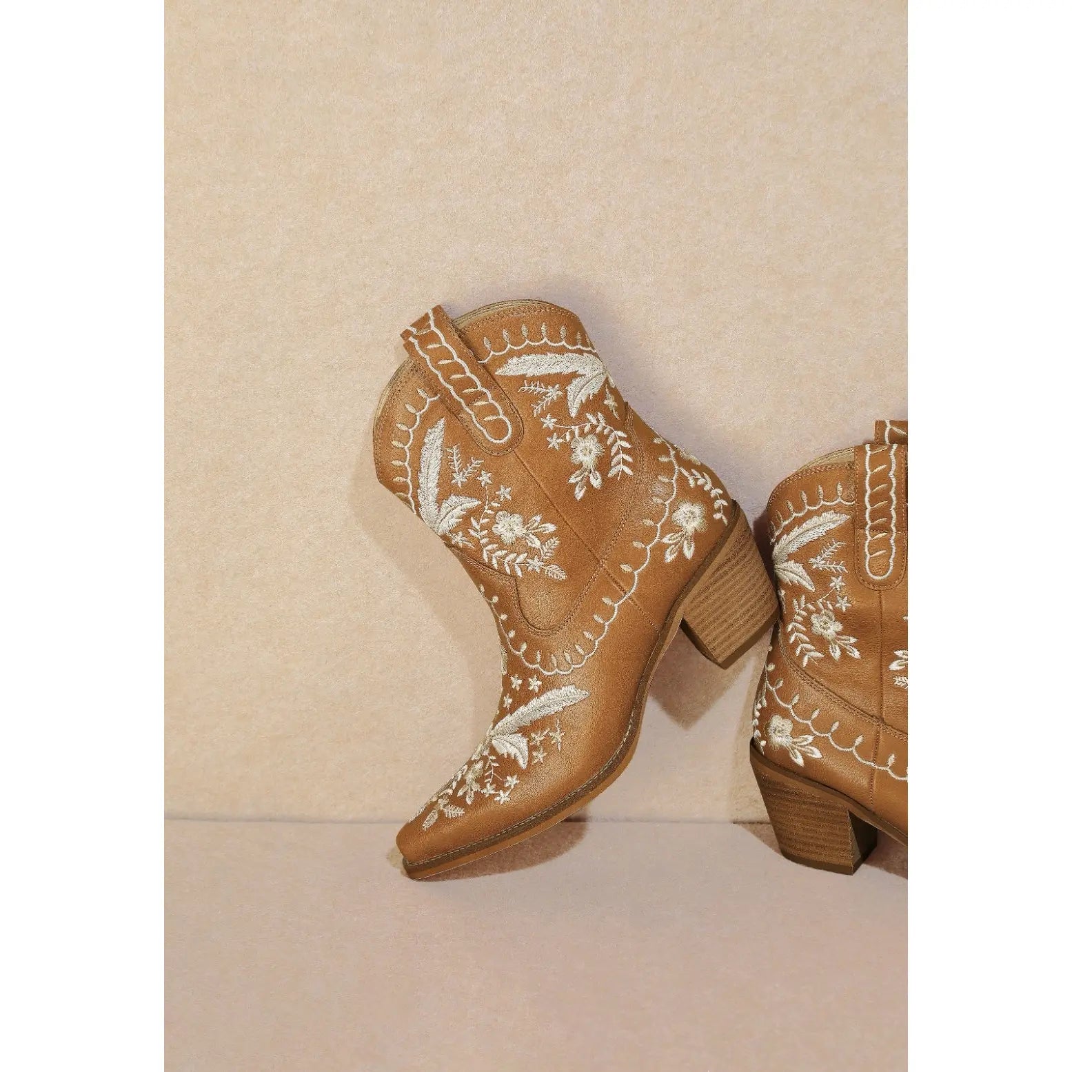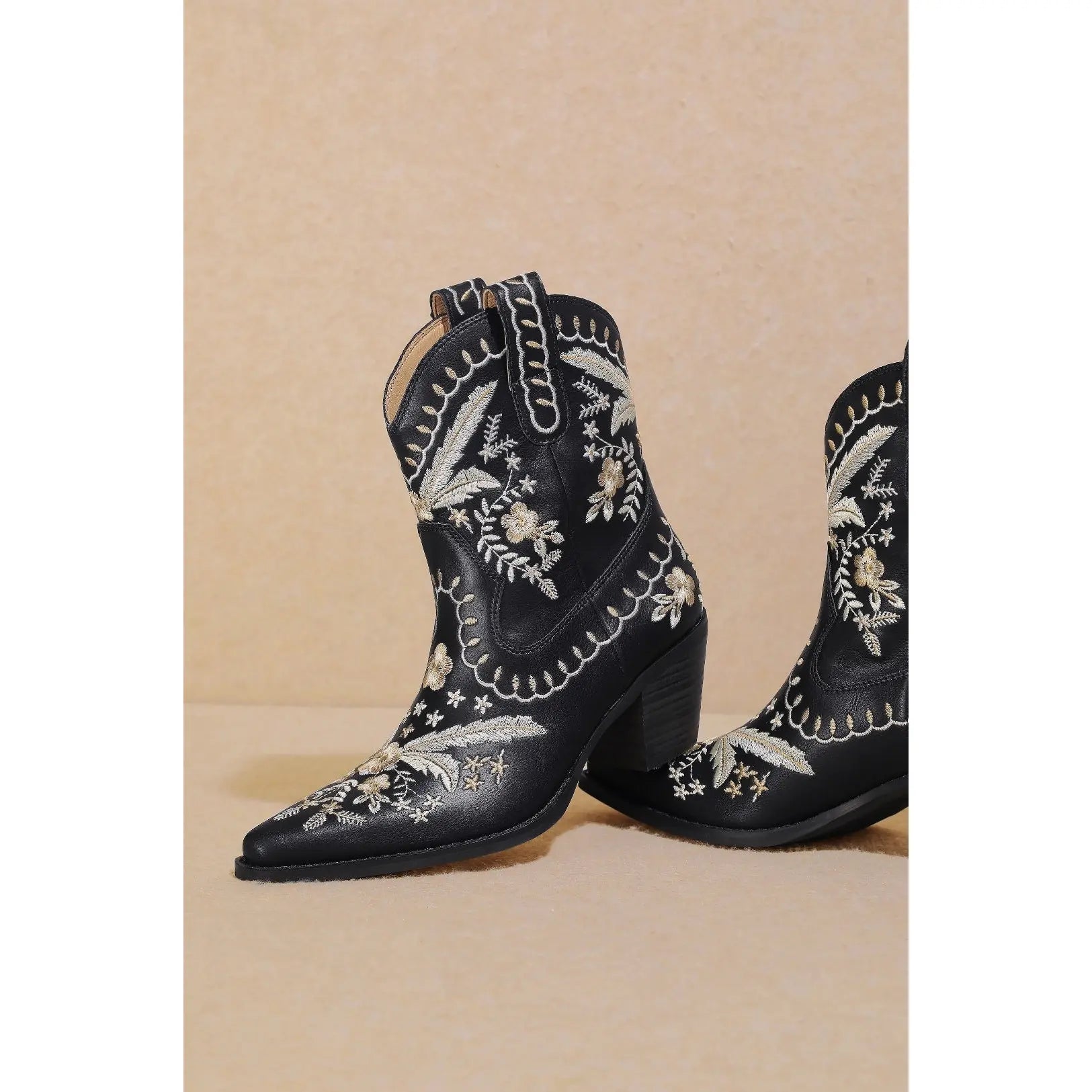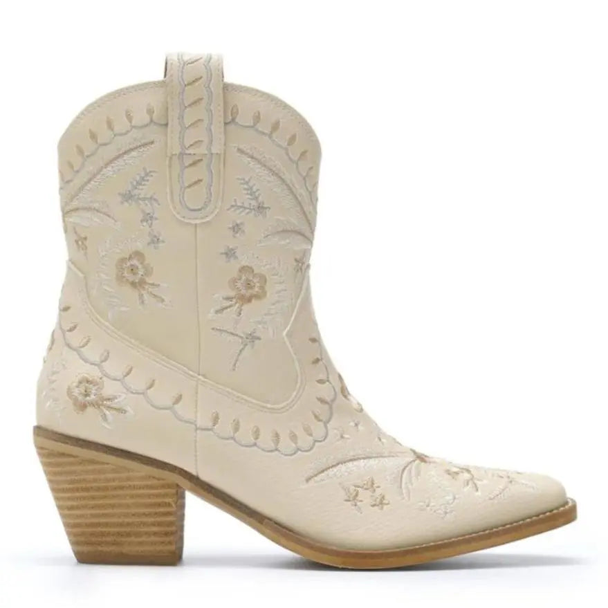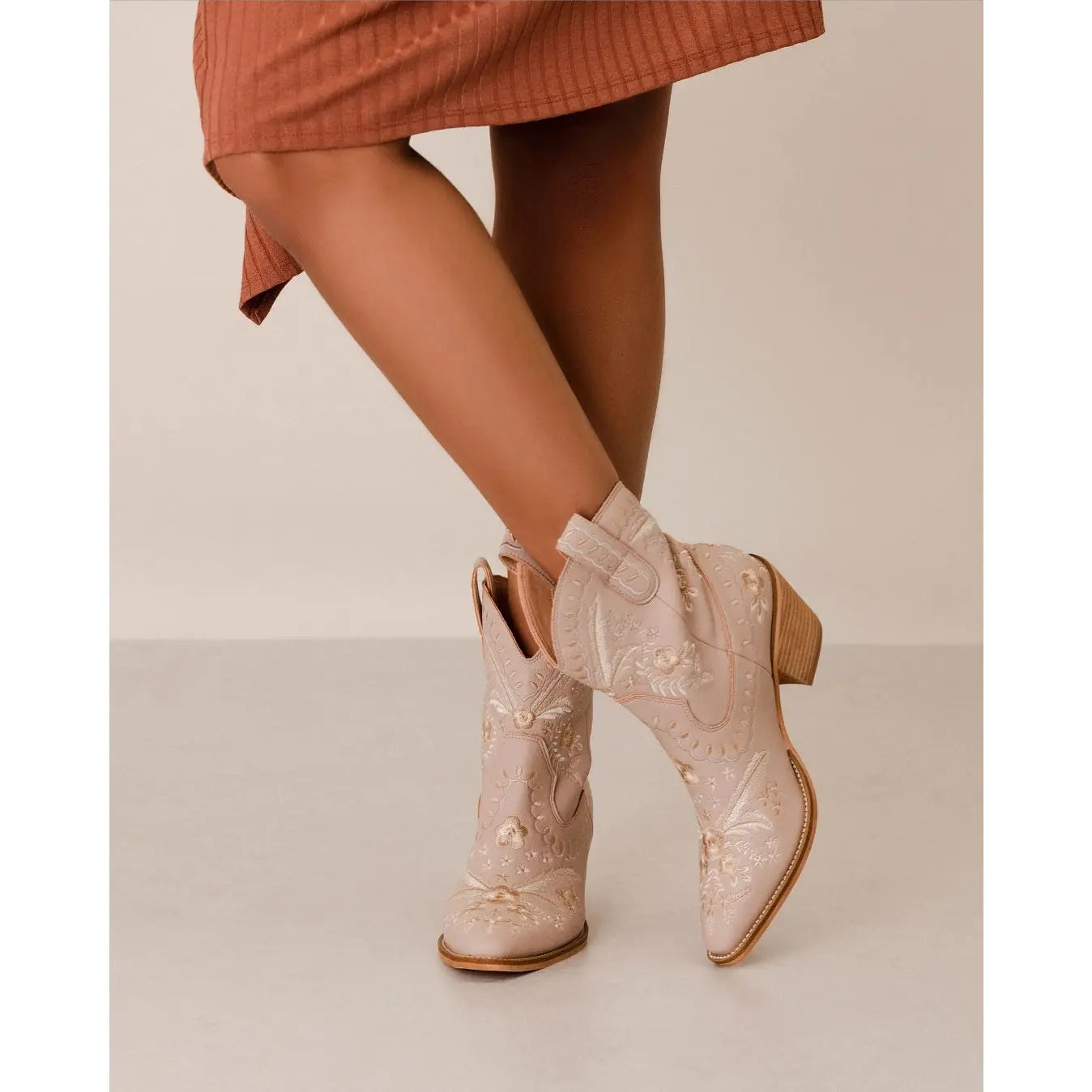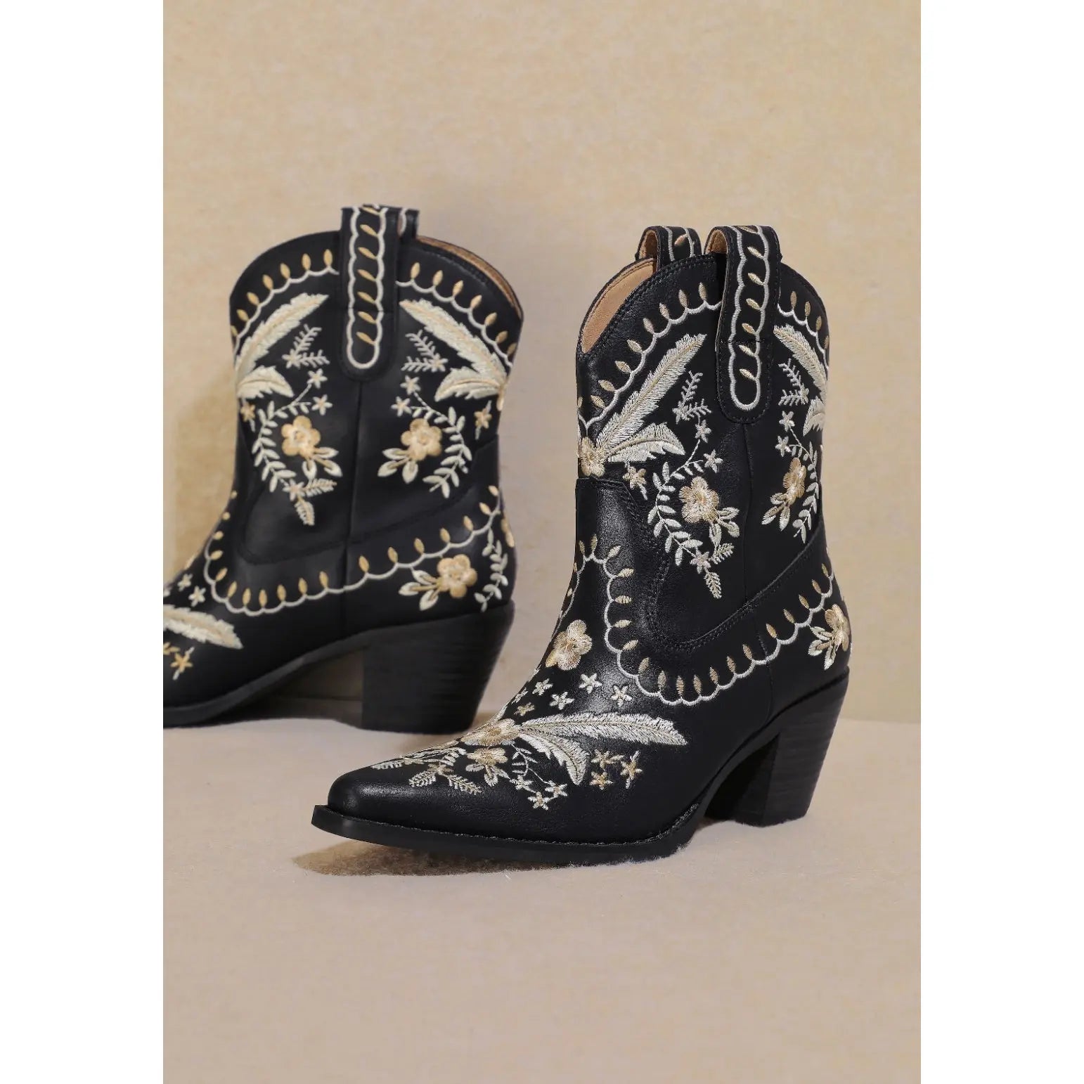 The Corral Boots, these boots feature classic western embroidery, a meticulously crafted wood grain heel, and a pointed toe, seamlessly blending traditional allure with contemporary style. Step confidently and make a statement in these exquisite cowgirl boots, embodying the flawless fusion of heritage and modernity.