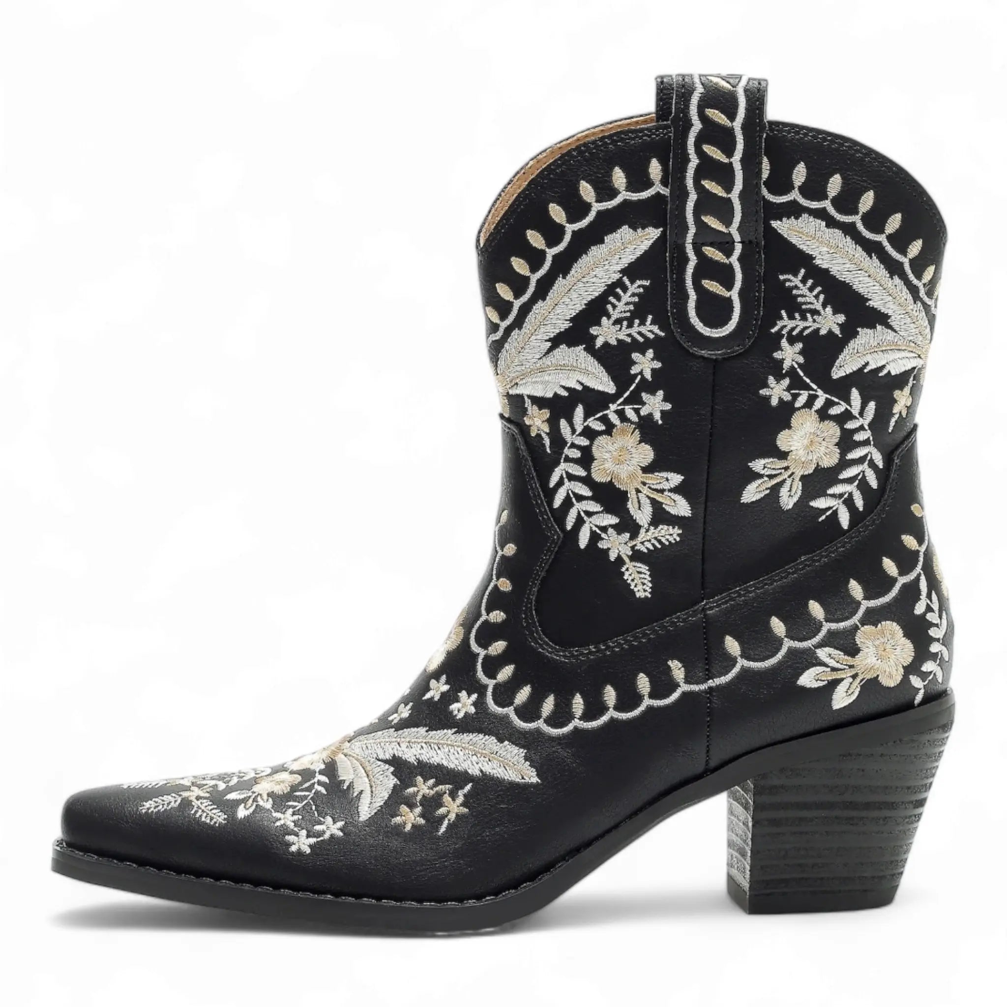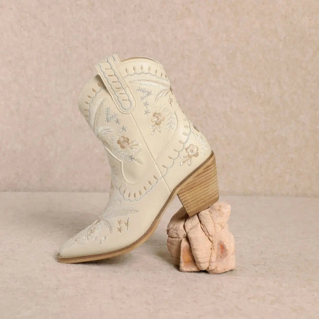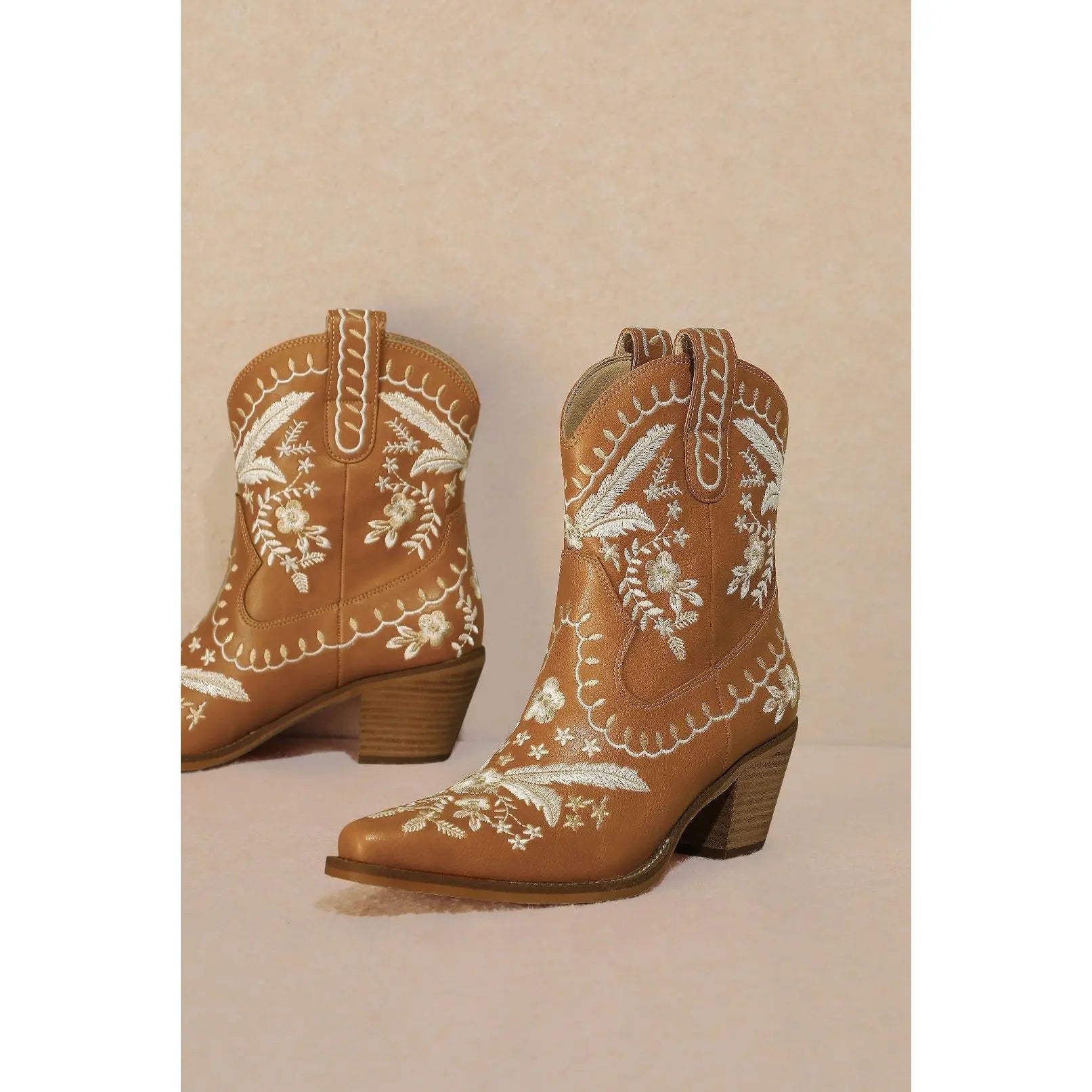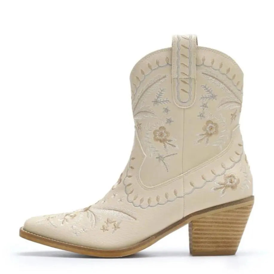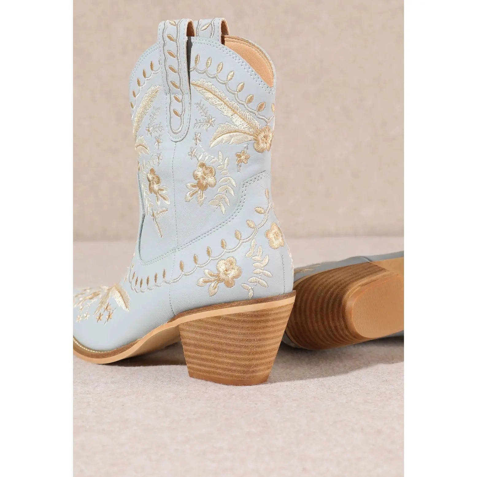 The Corral Boots, these boots feature classic western embroidery, a meticulously crafted wood grain heel, and a pointed toe, seamlessly blending traditional allure with contemporary style. Step confidently and make a statement in these exquisite cowgirl boots, embodying the flawless fusion of heritage and modernity.