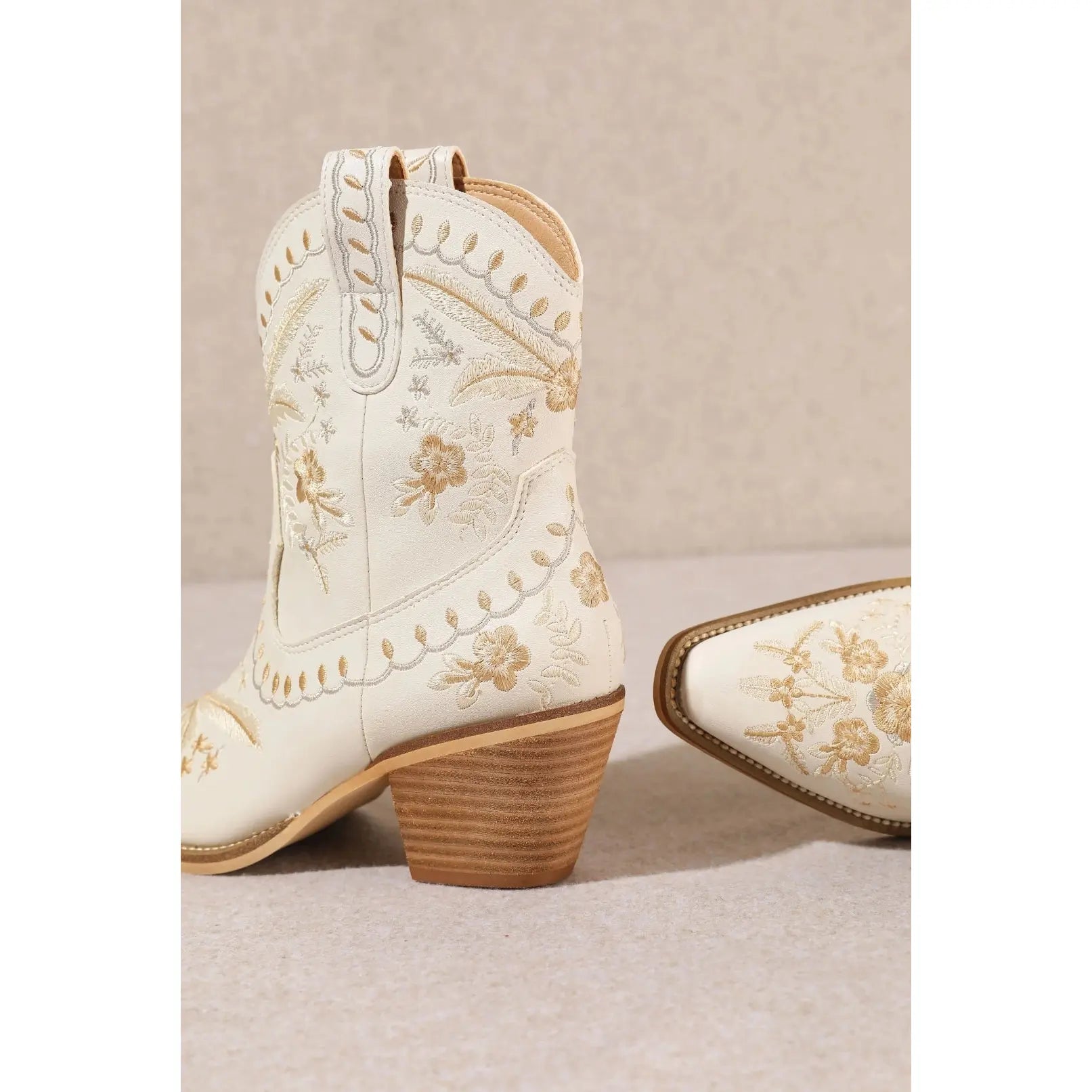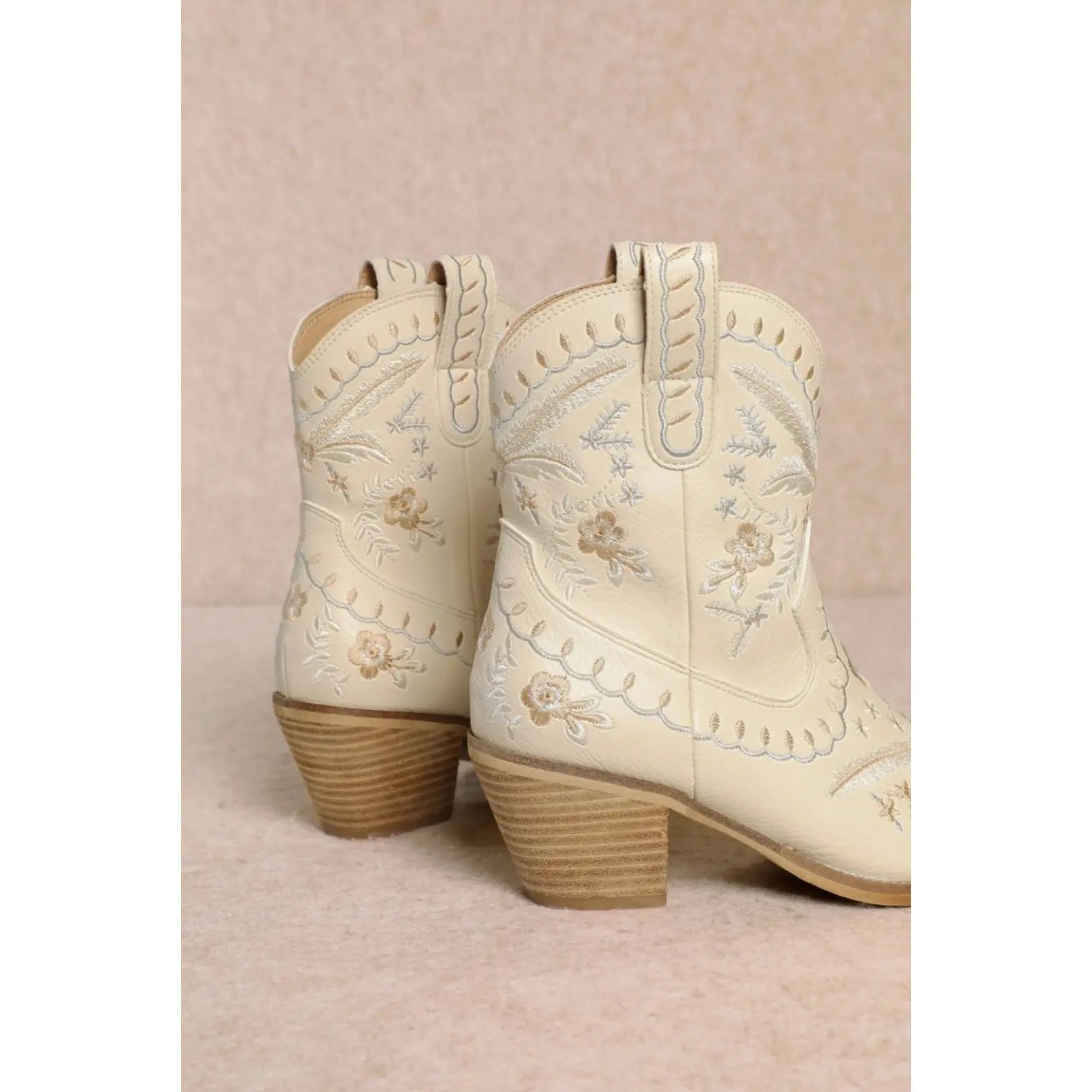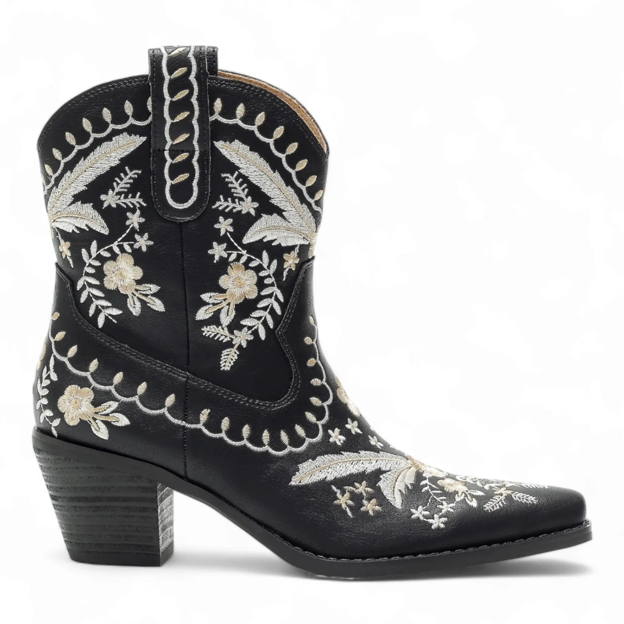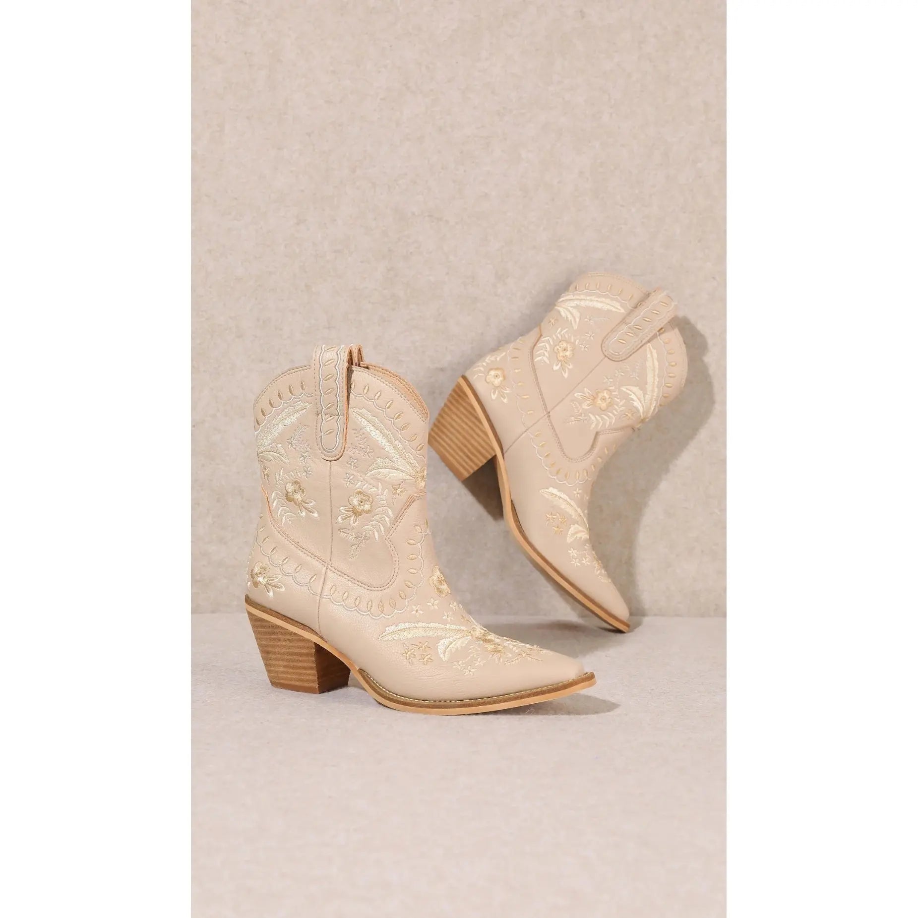 The Corral Boots, these boots feature classic western embroidery, a meticulously crafted wood grain heel, and a pointed toe, seamlessly blending traditional allure with contemporary style. Step confidently and make a statement in these exquisite cowgirl boots, embodying the flawless fusion of heritage and modernity.